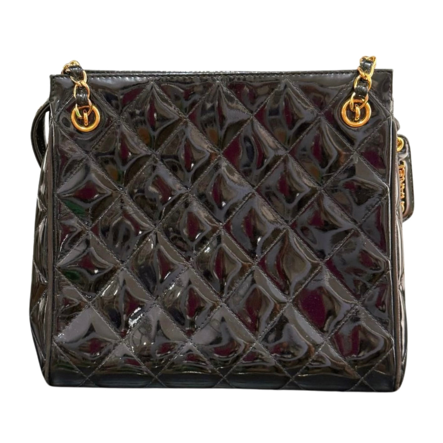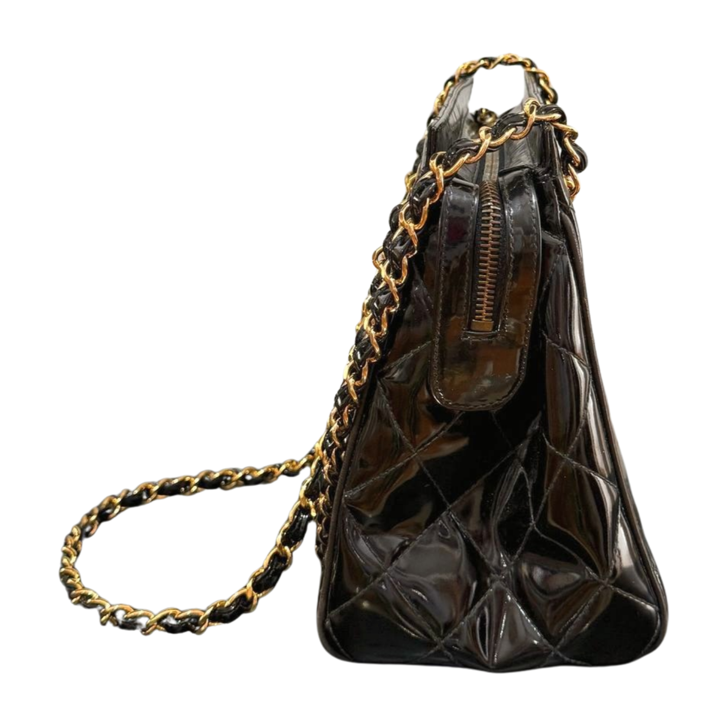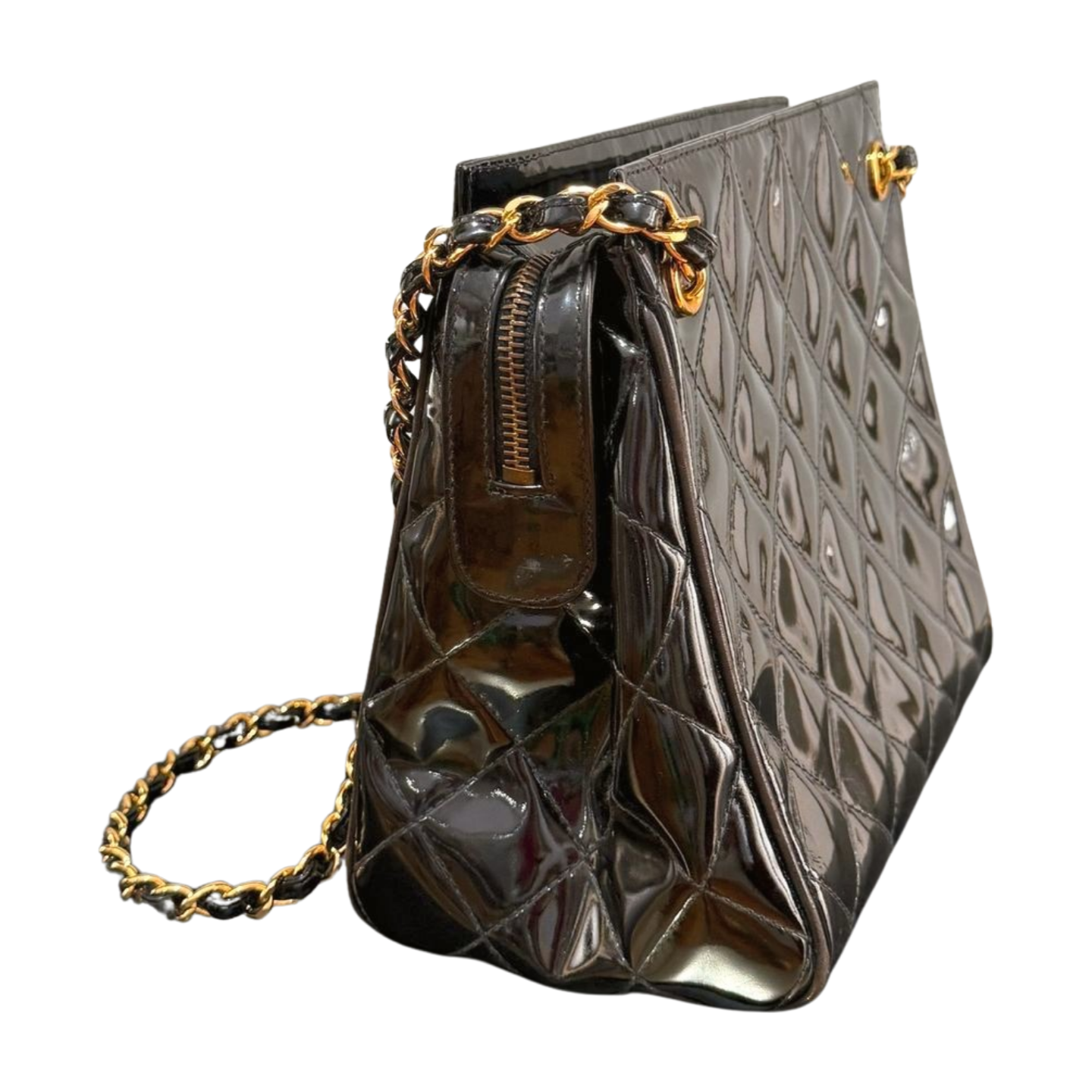 Elevate your daily carry with this chic and practical Chanel Shopping Tote, crafted in luminous black patent leather. The iconic diamond quilting and mini size make a powerful statement, while the signature chain straps complete this piece of enduring Parisian elegance.