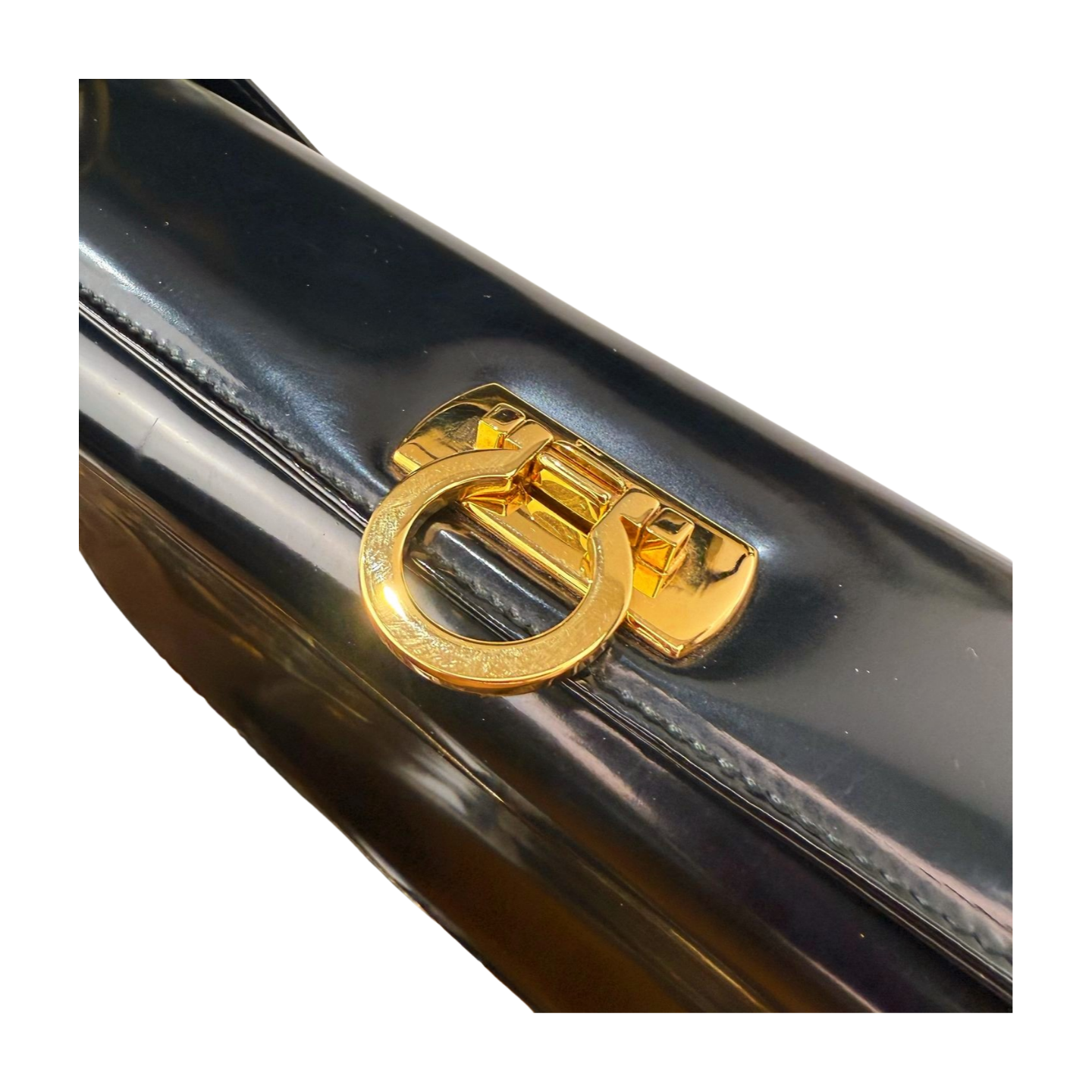 Exude sophisticated Italian elegance with this stunning Salvatore Ferragamo box handbag, crafted from shiny smooth black calf leather. The luxurious gold-tone hardware provides a striking contrast, featuring the signature Gancini clasp that signifies the house's storied heritage.