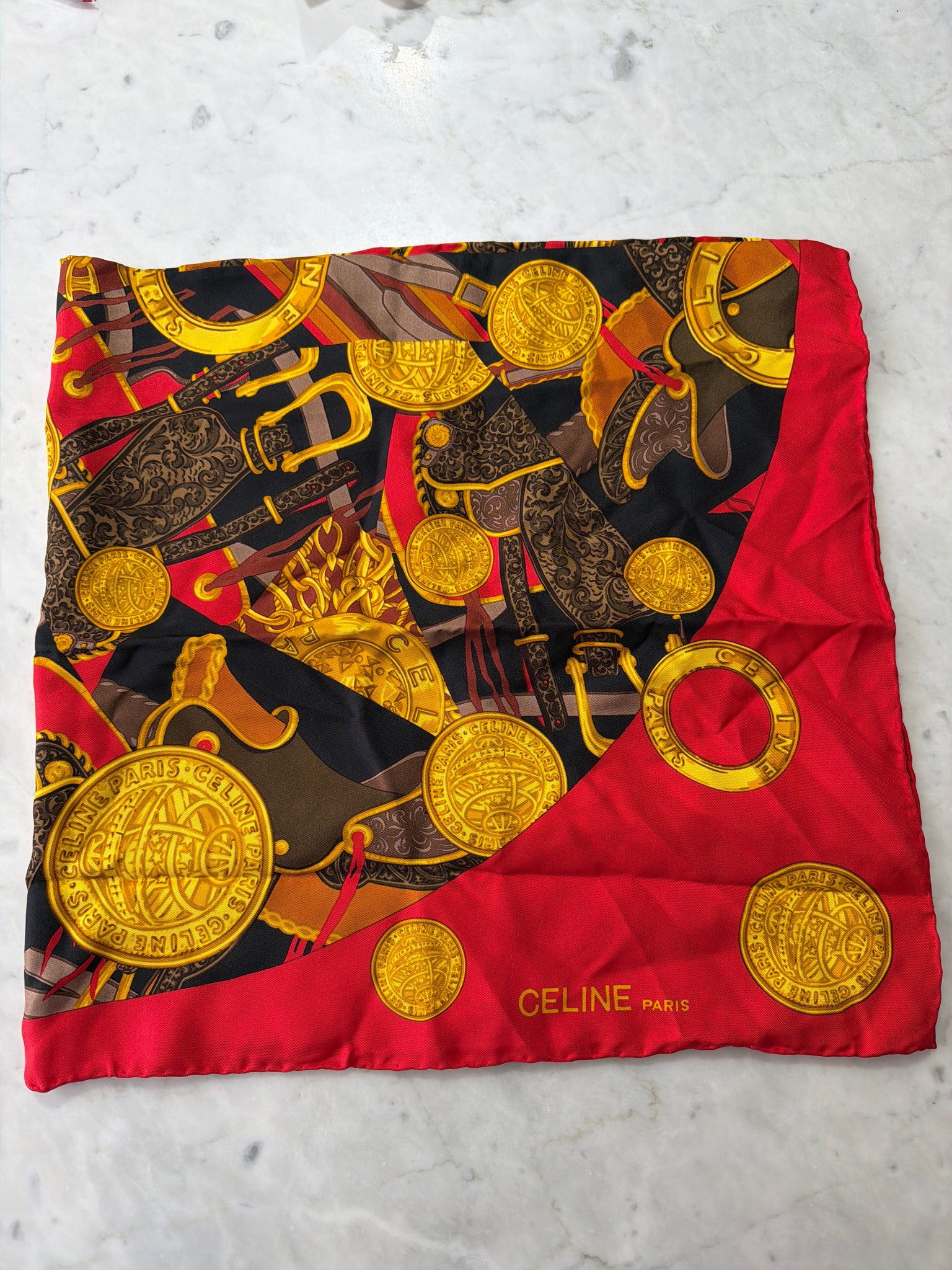 Celine silk scarf with buckle and coin print.