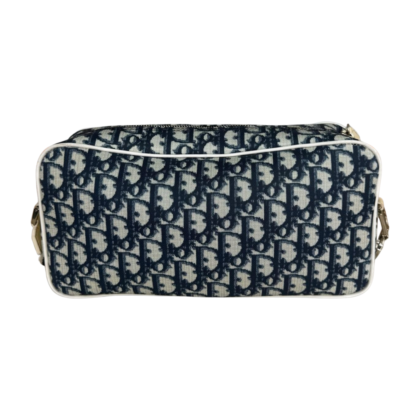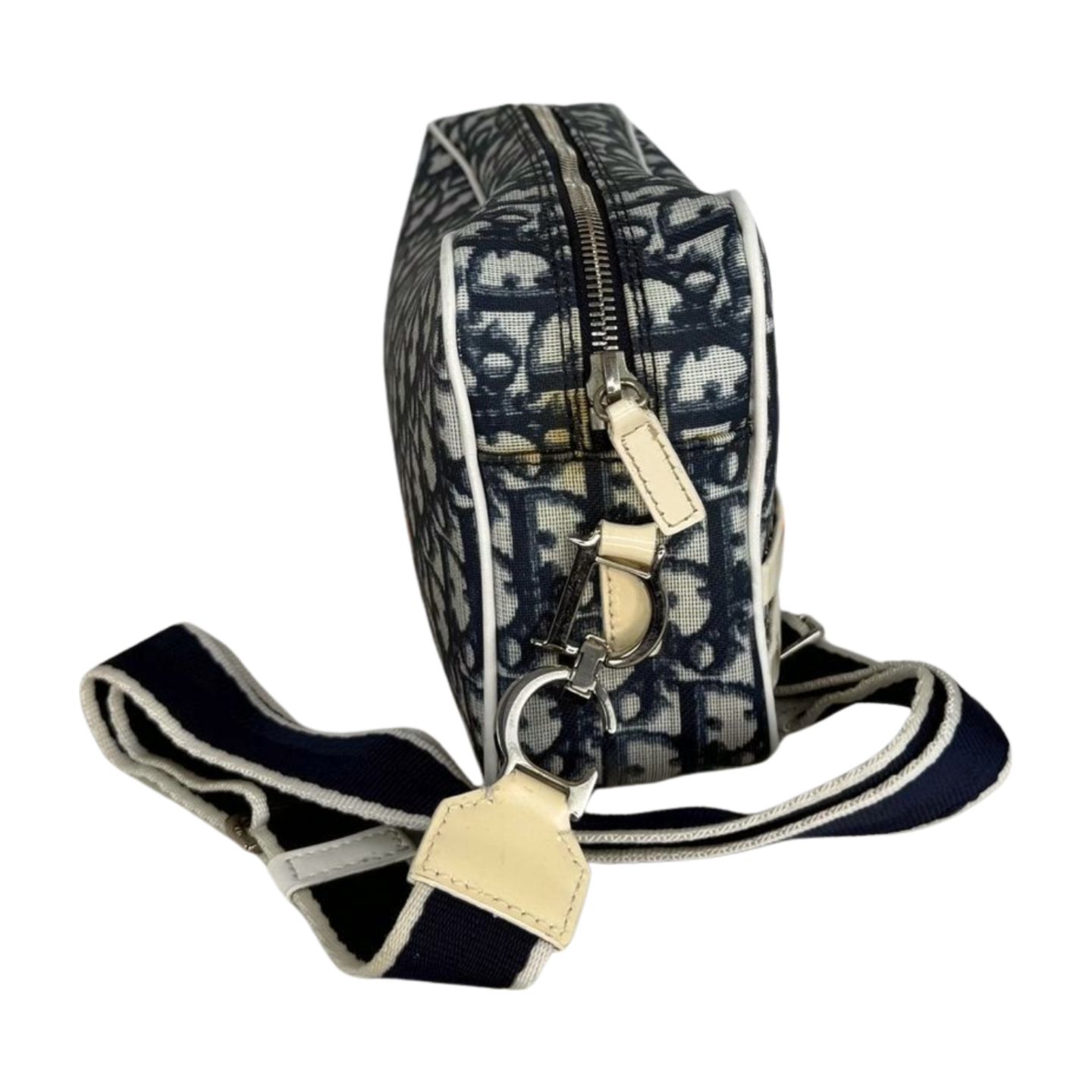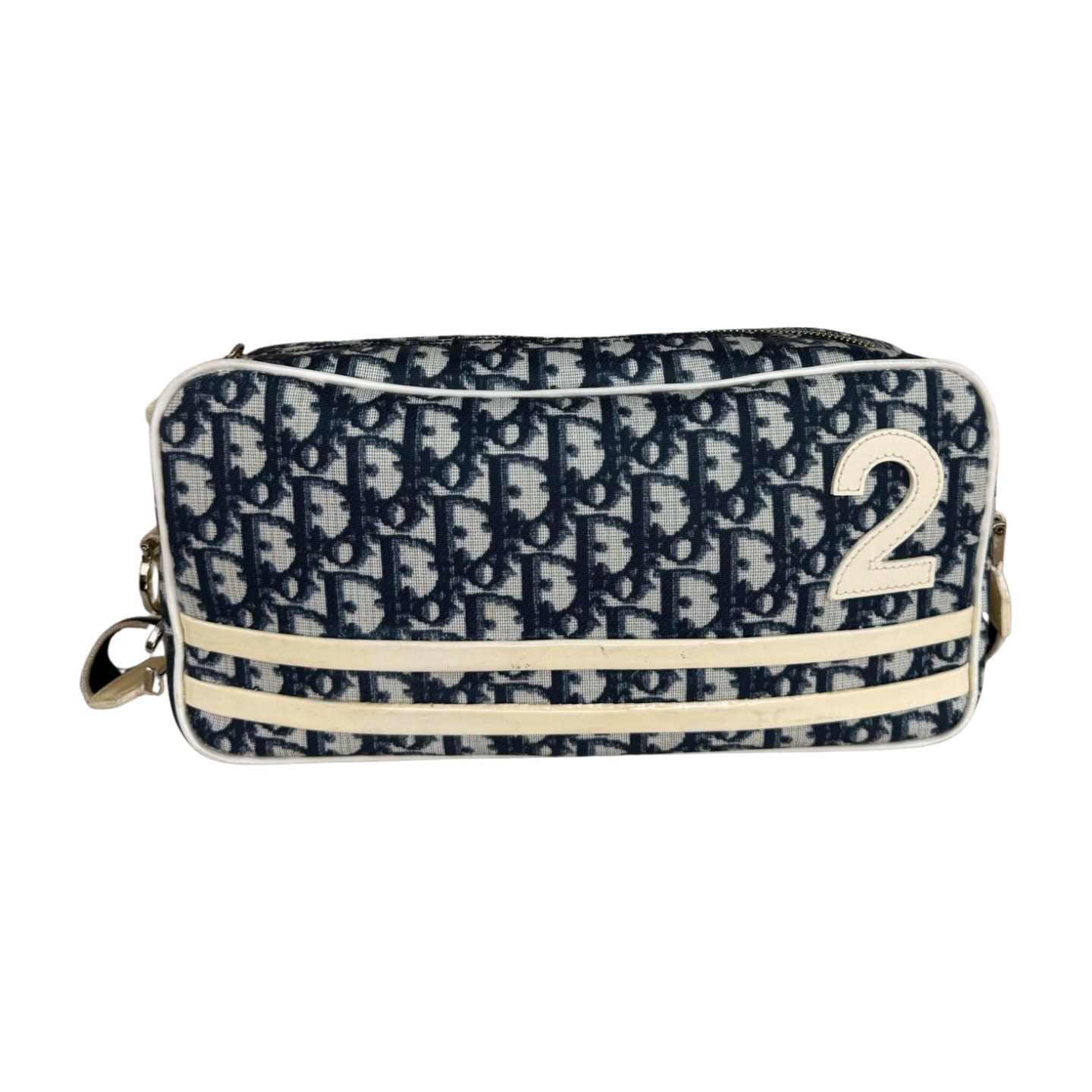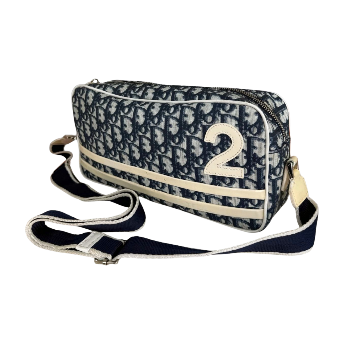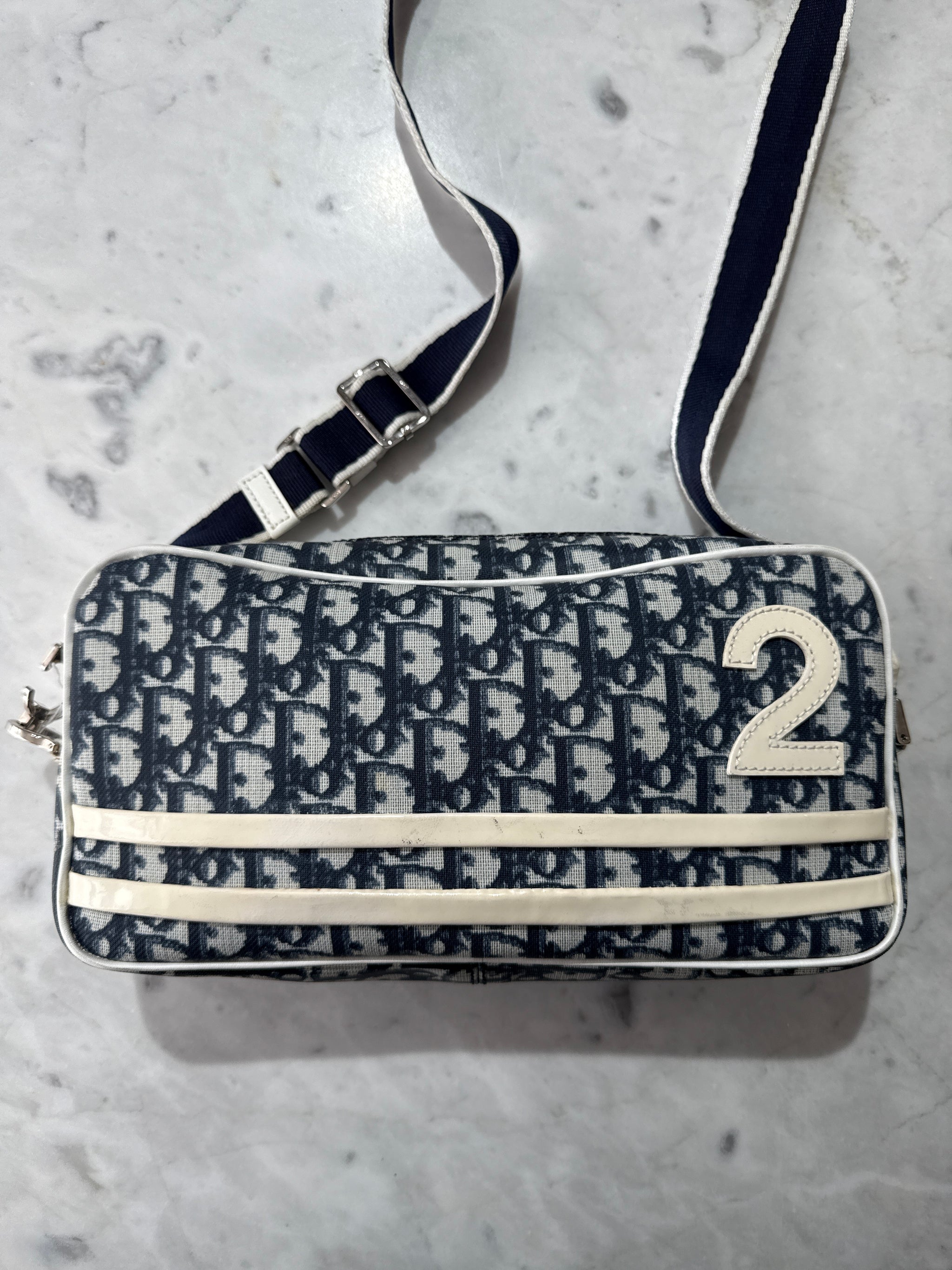 A sporty-chic Dior shoulder bag crafted in iconic blue Dior Oblique canvas, accented with cream leather trim and the signature “2” patch detail. The compact zip-top silhouette is finished with an adjustable webbed strap for comfortable crossbody wear. A collectible vintage piece that blends Dior heritage with effortless everyday style