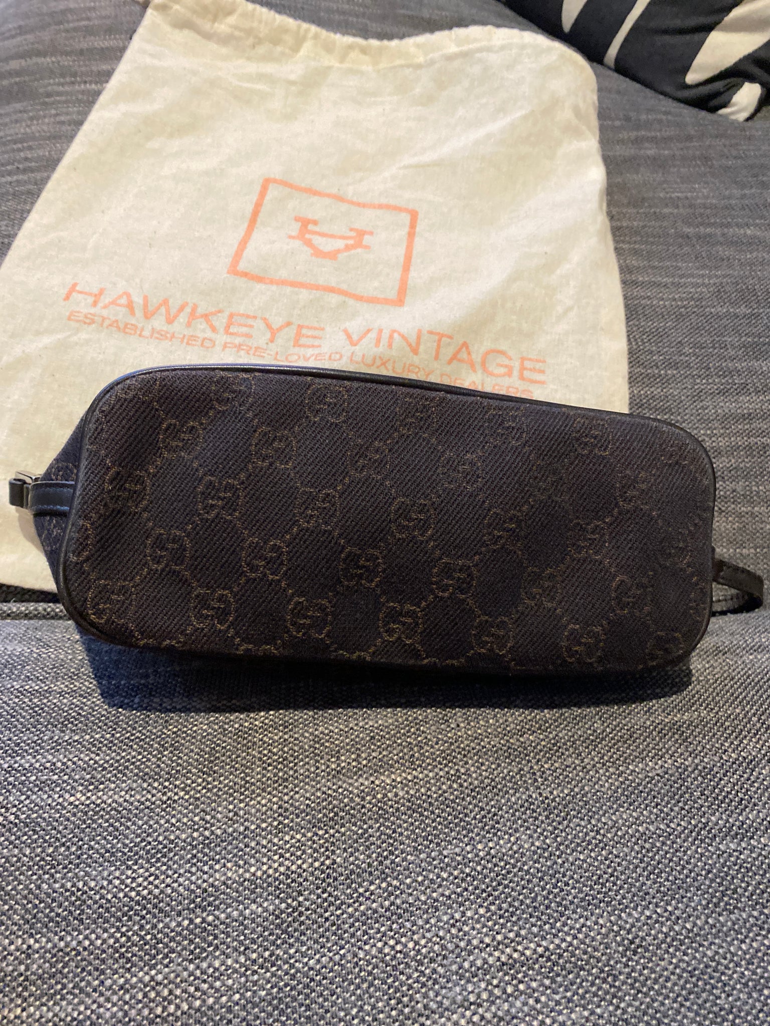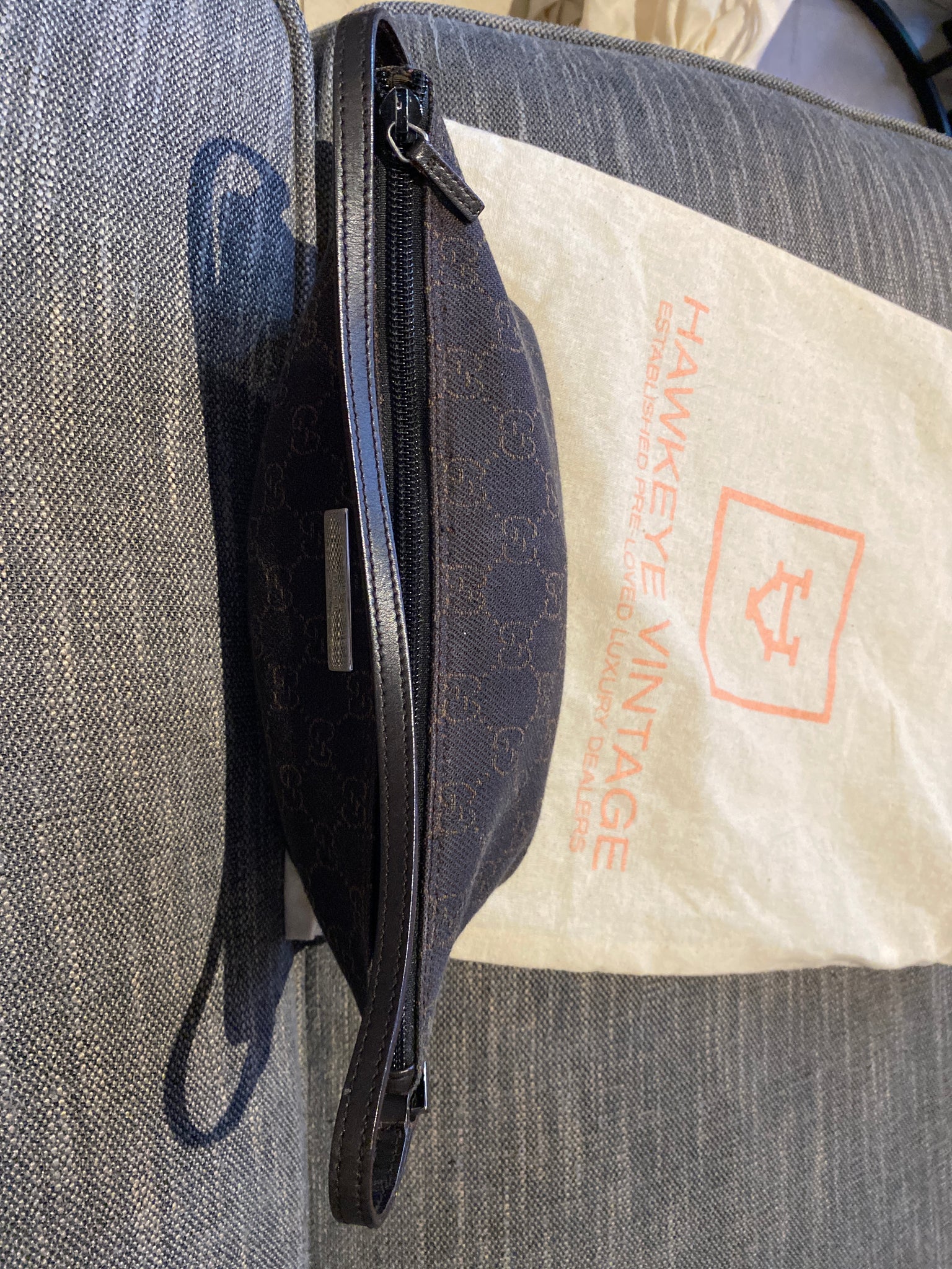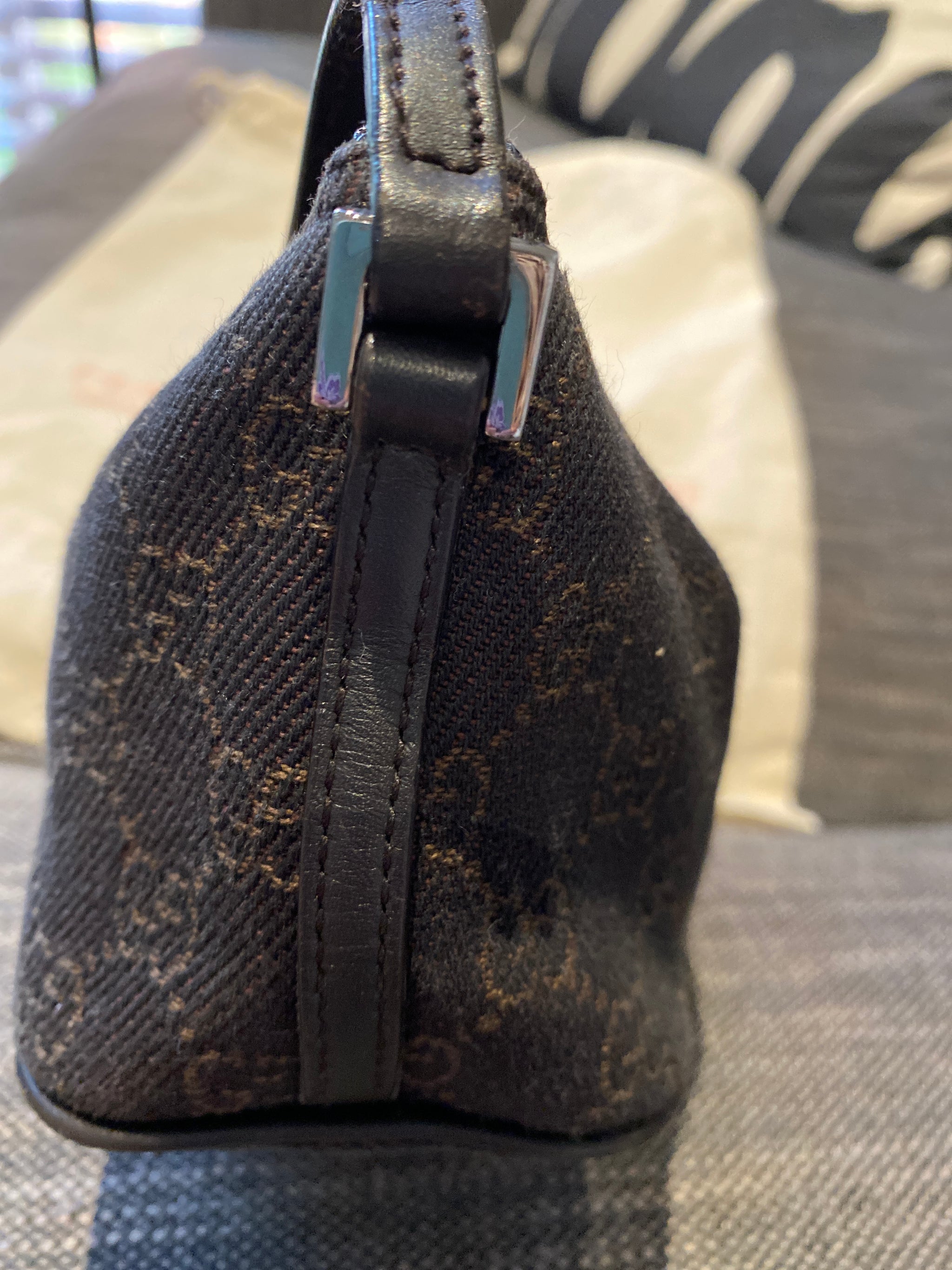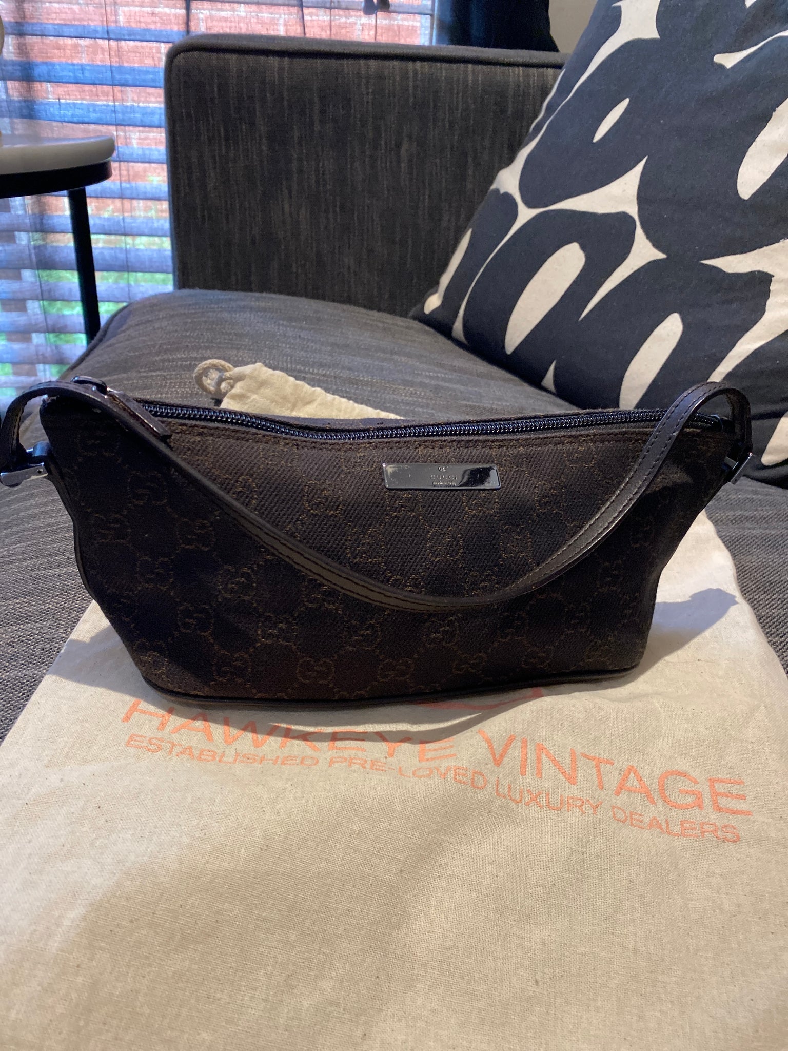 Gucci monogram boat pouchette bag. In chocolate brown fabric. Excellent condition. No wear, rubbing or rips to the bag nor the leather strap, its in perfect condition like new.
