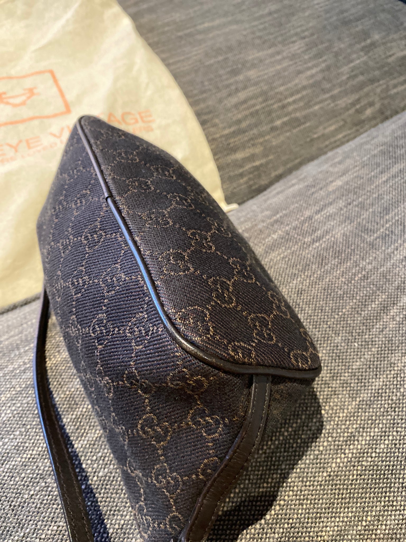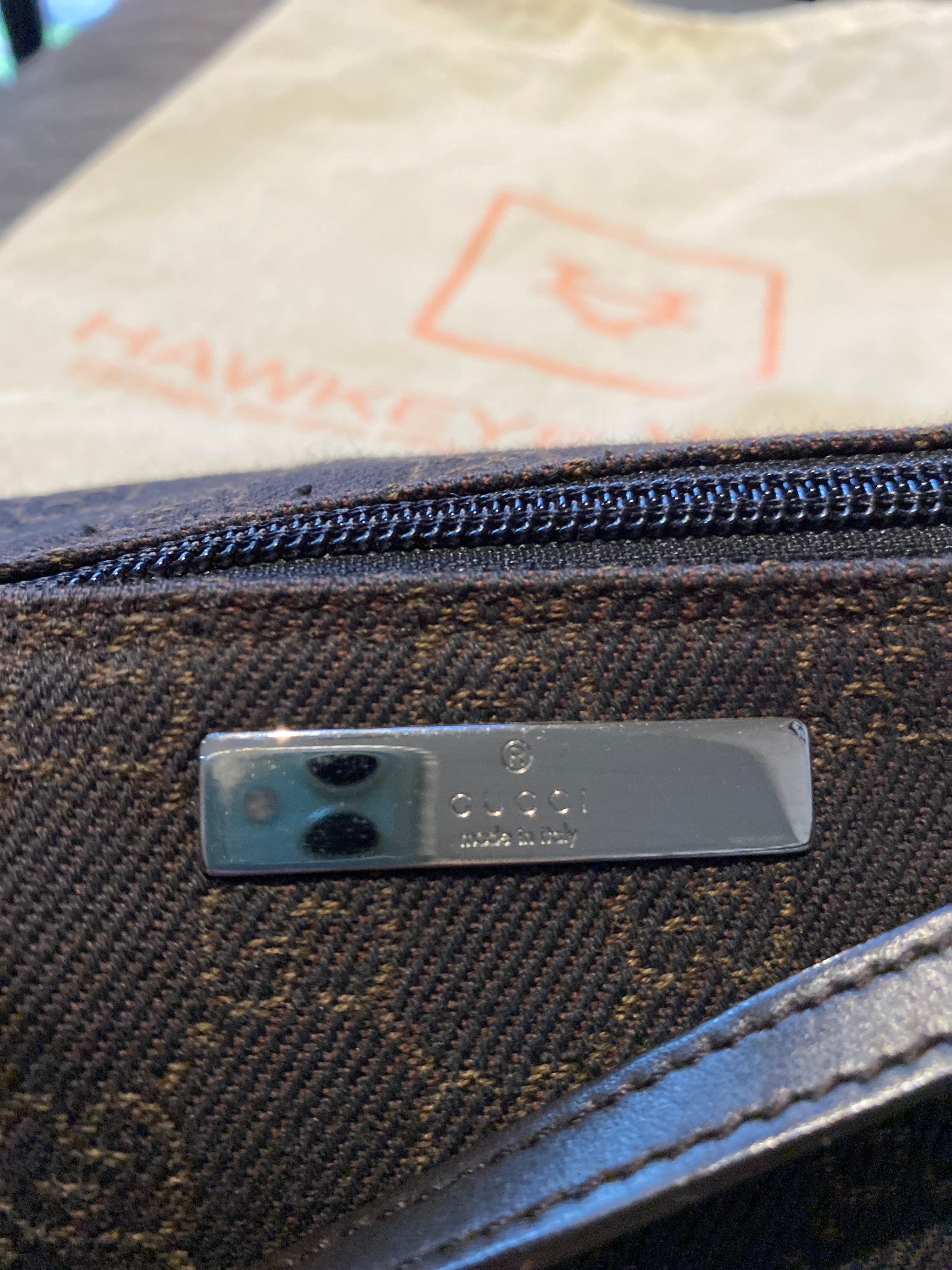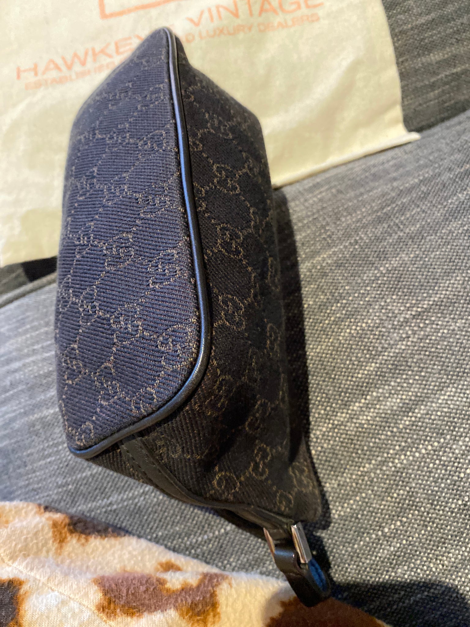 Gucci monogram boat pouchette bag. In chocolate brown fabric. Excellent condition. No wear, rubbing or rips to the bag nor the leather strap, its in perfect condition like new.