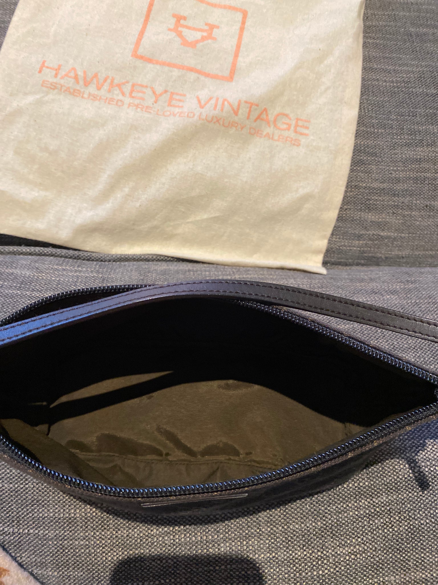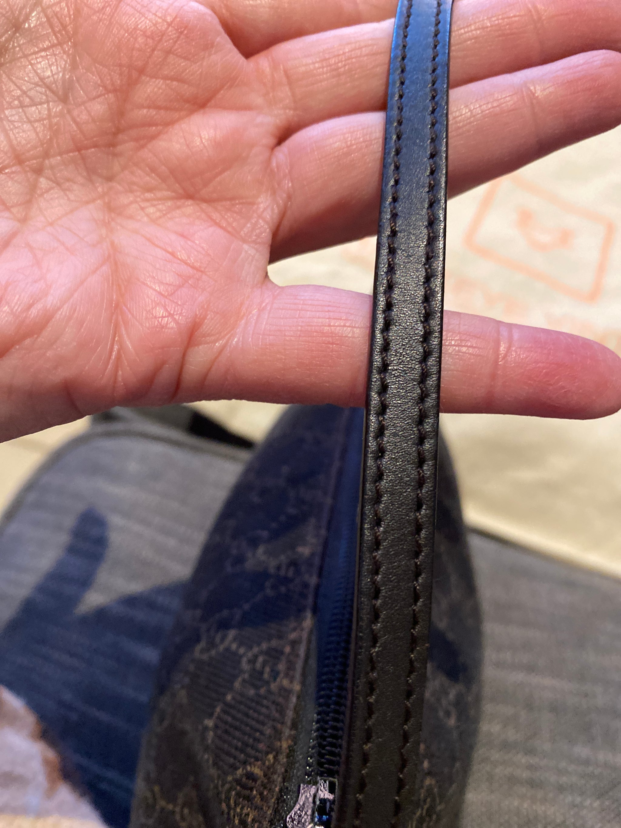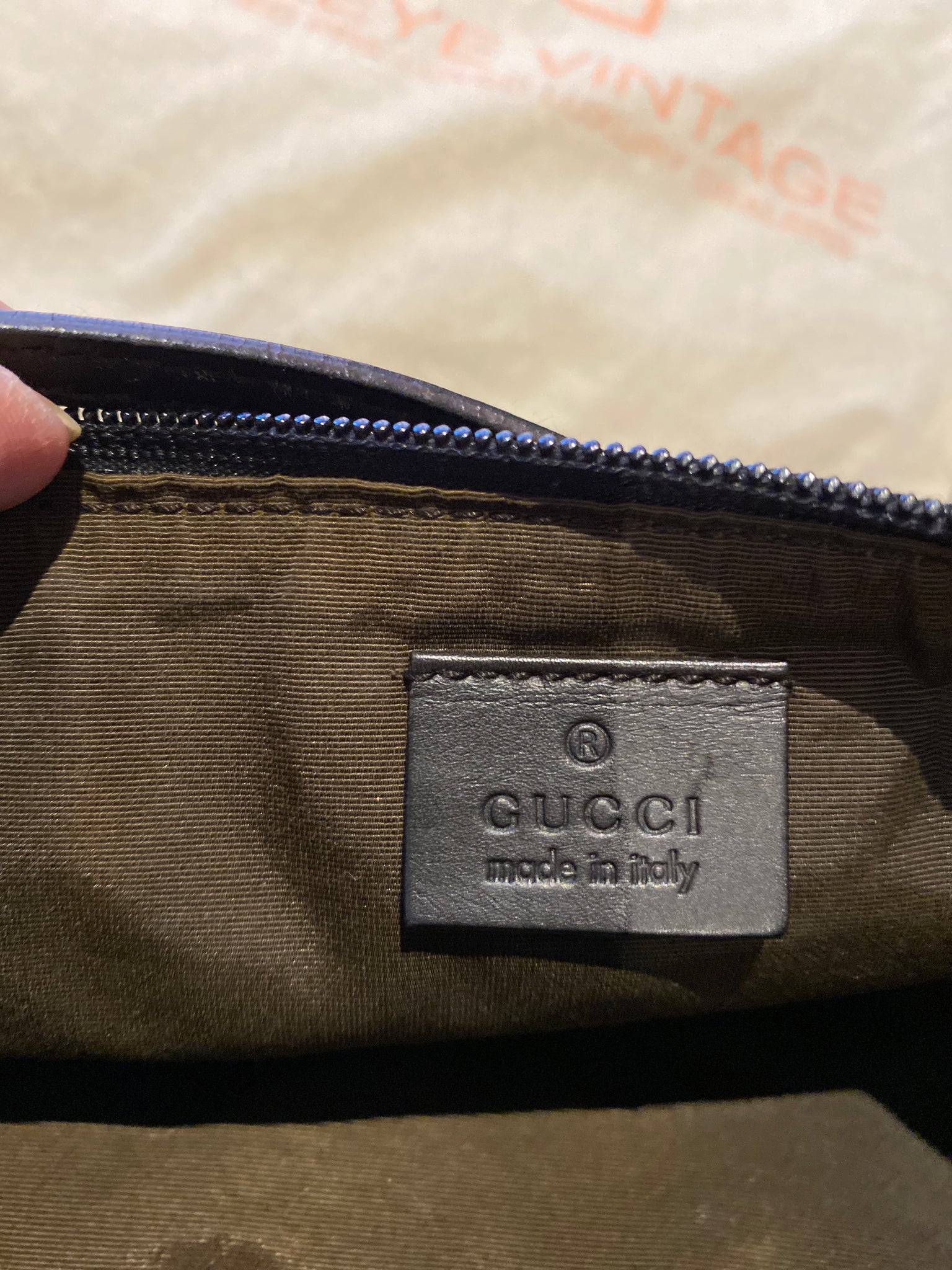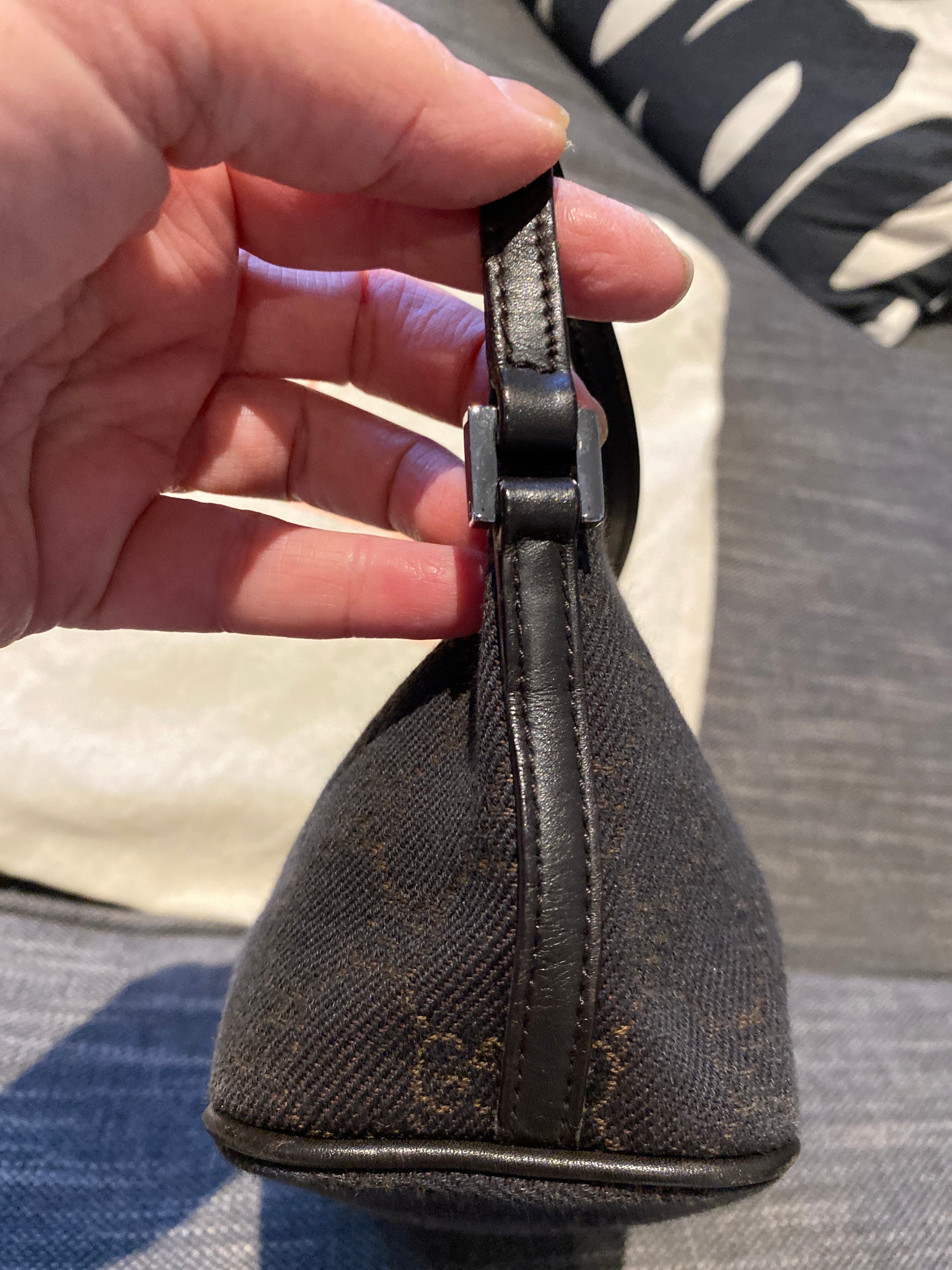 Gucci monogram boat pouchette bag. In chocolate brown fabric. Excellent condition. No wear, rubbing or rips to the bag nor the leather strap, its in perfect condition like new.