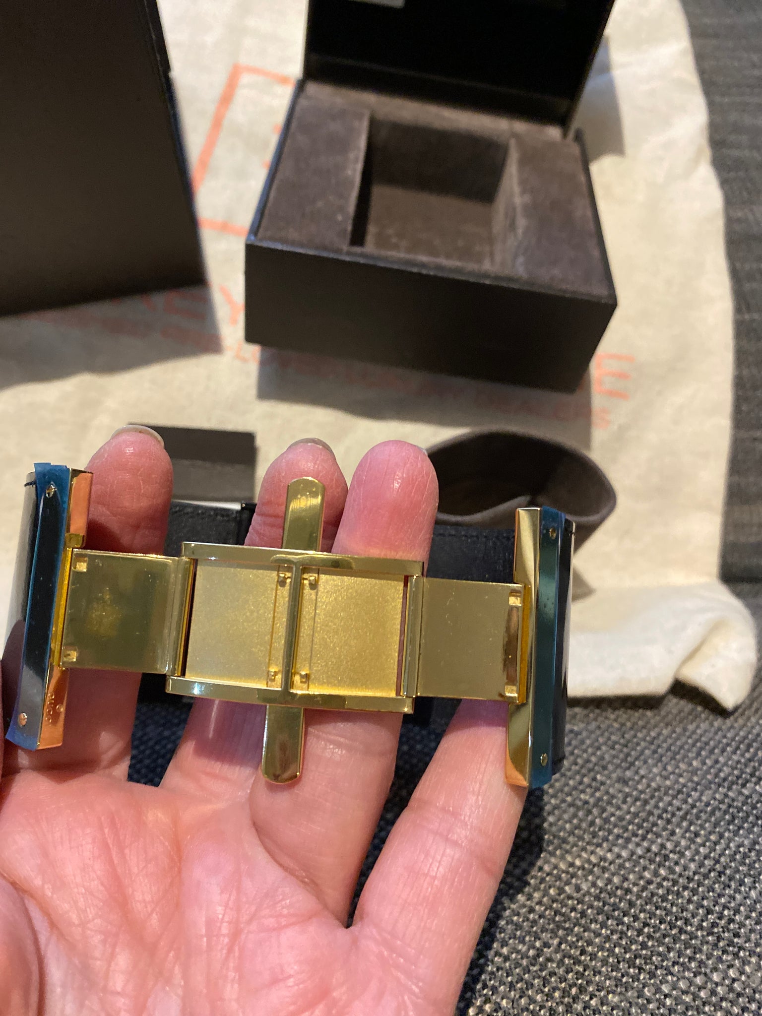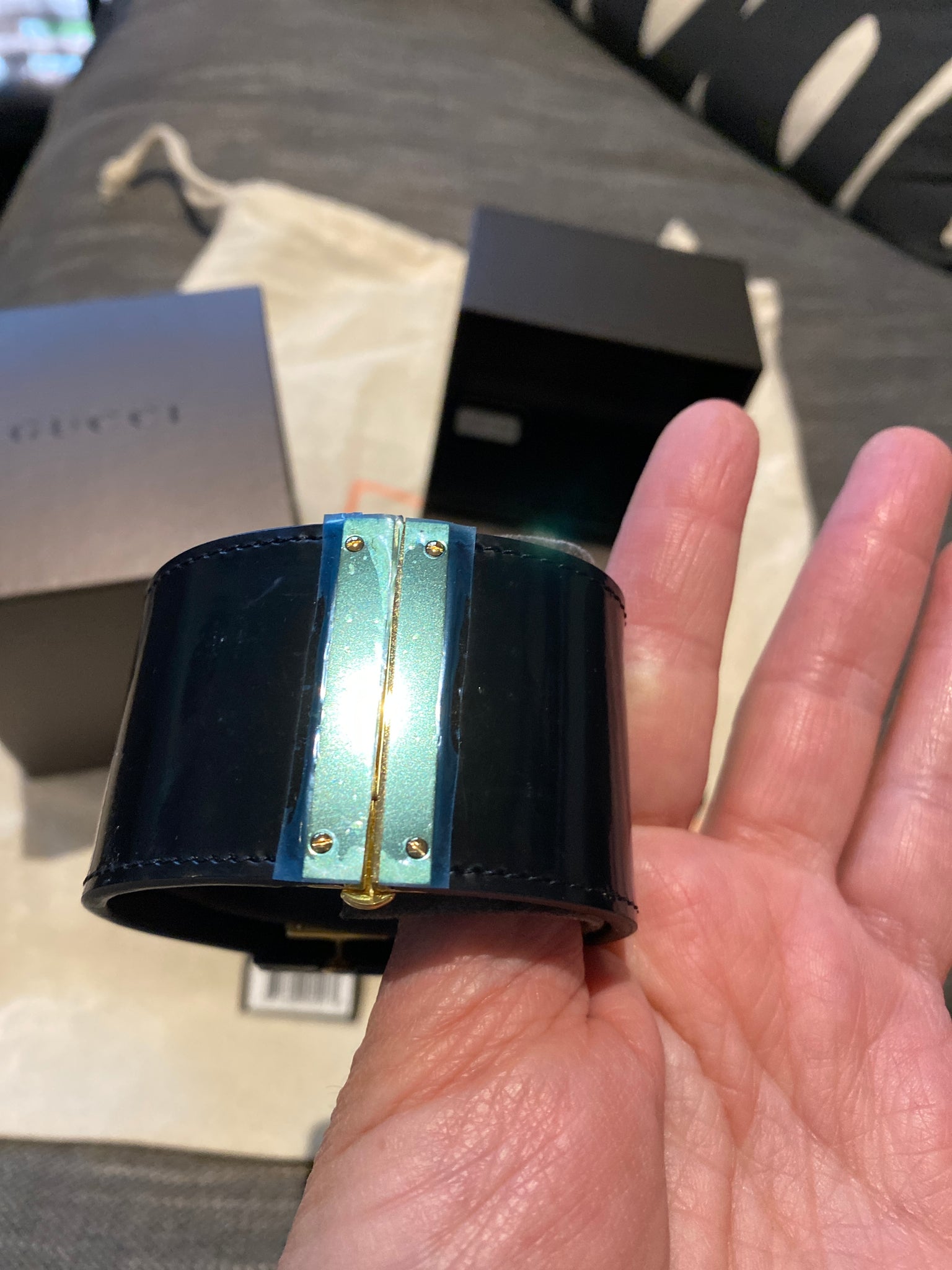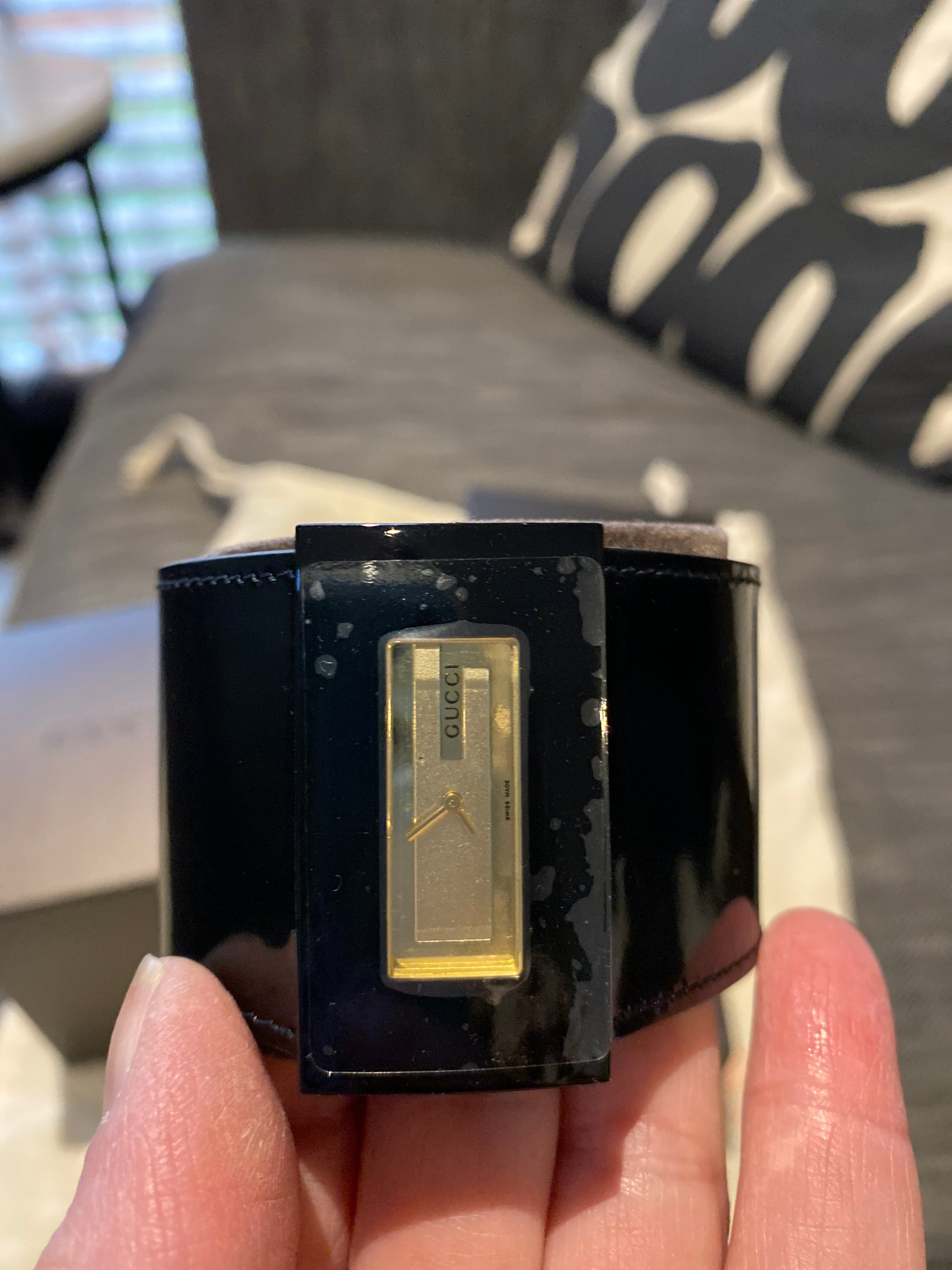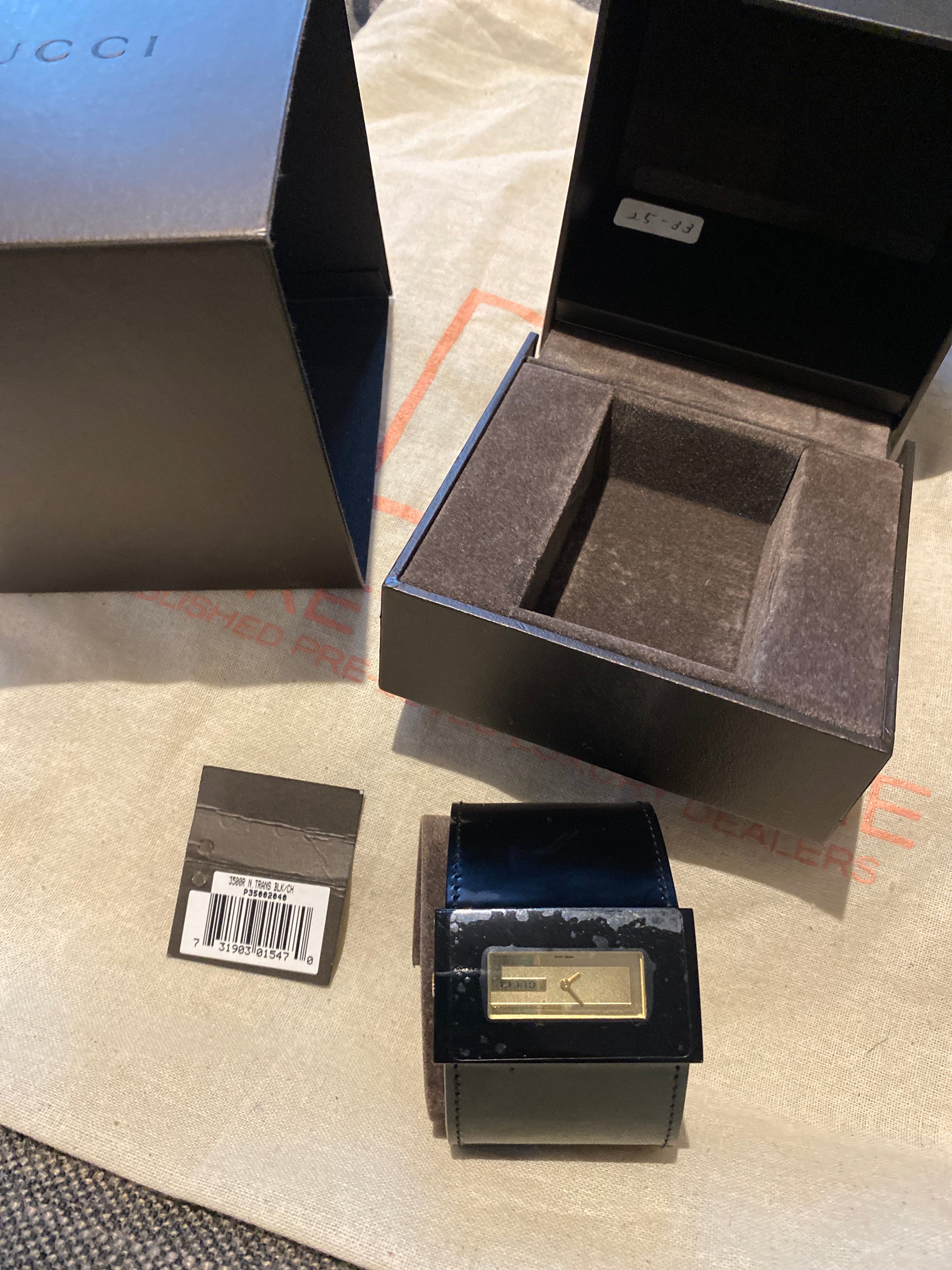 Gucci leather cuff watch with gold face. Full set with box. Still has plastic covers on watches face and gold hardware Size 16 cm . In excellent condition Too small for me