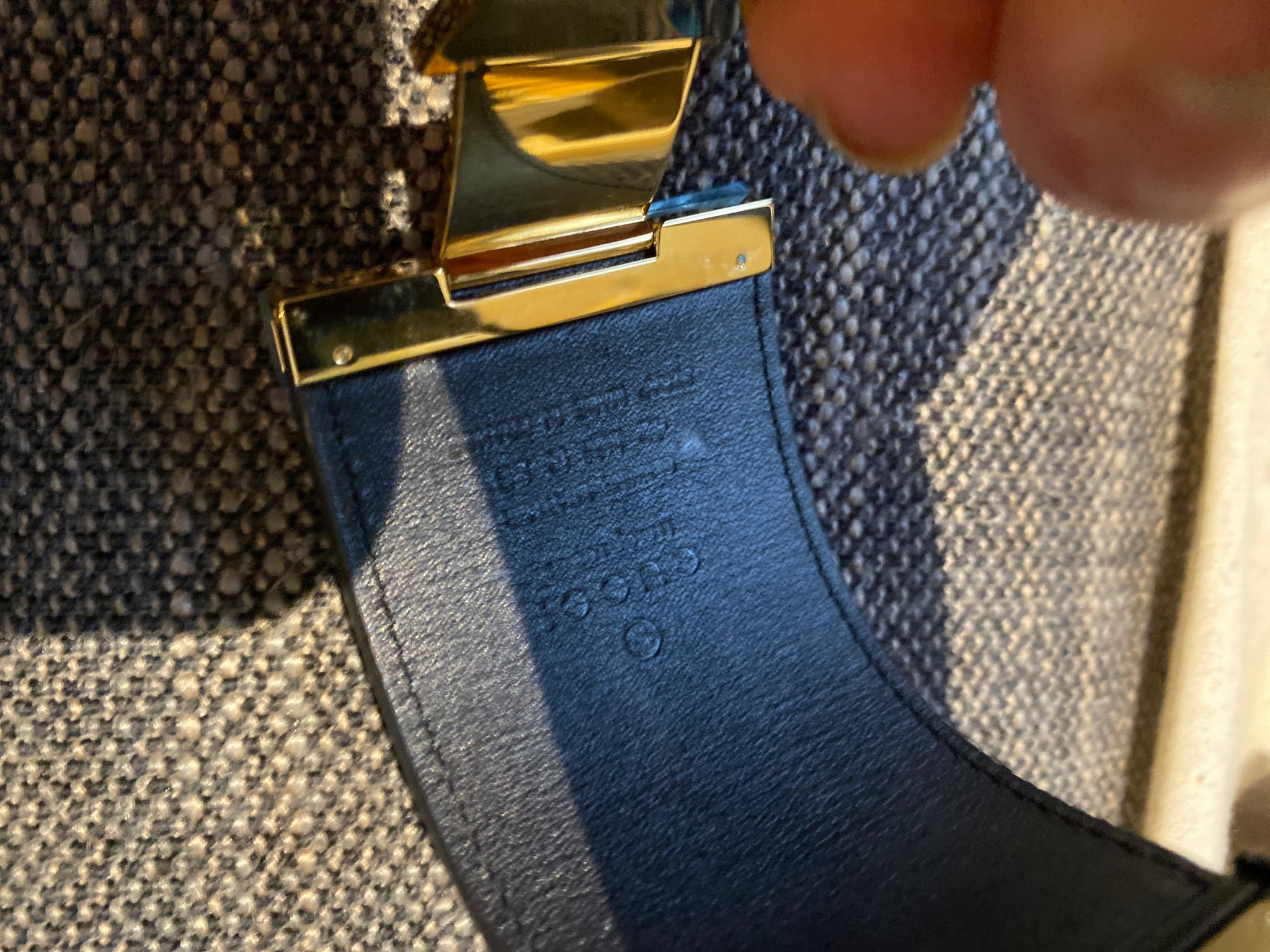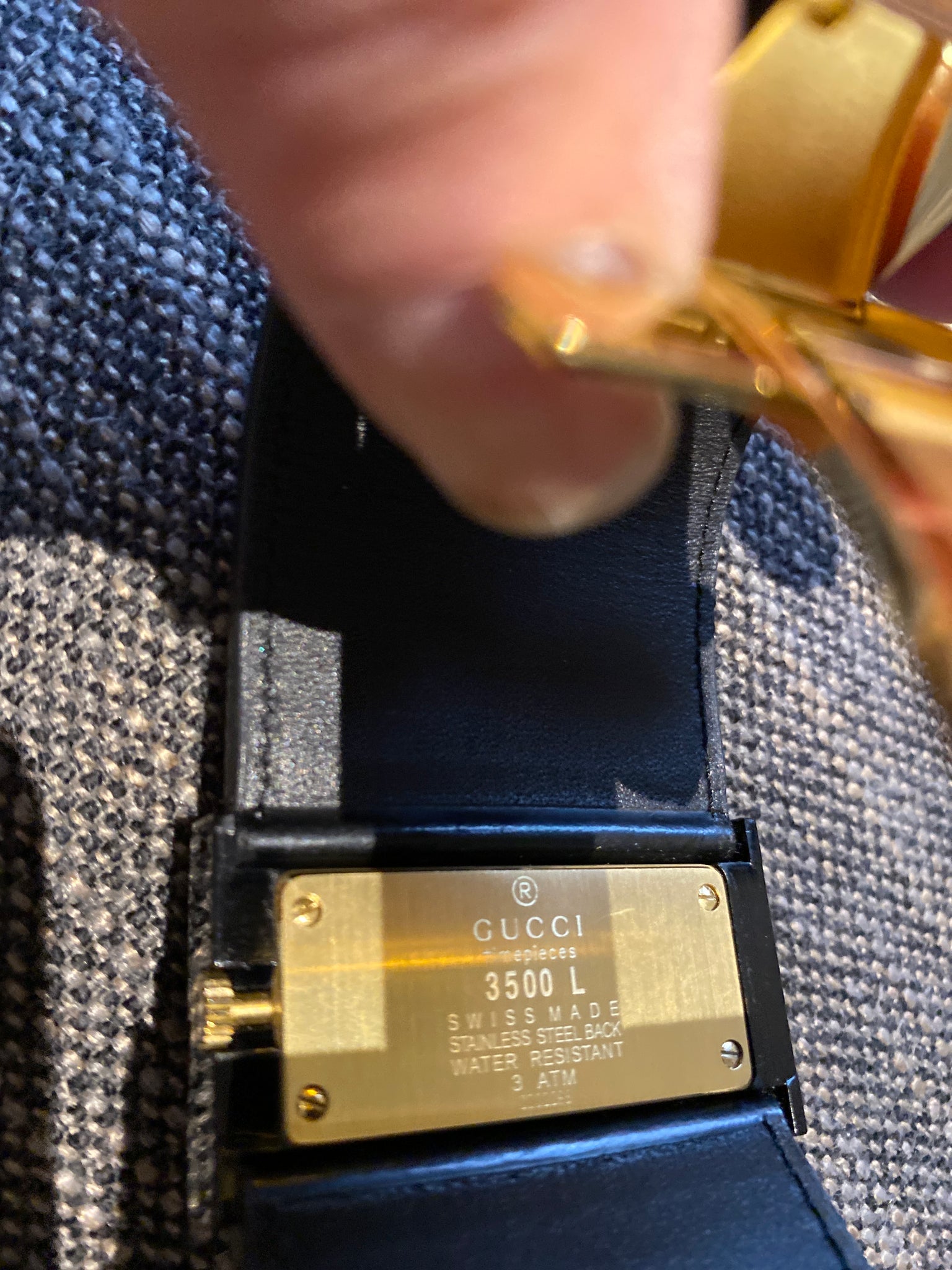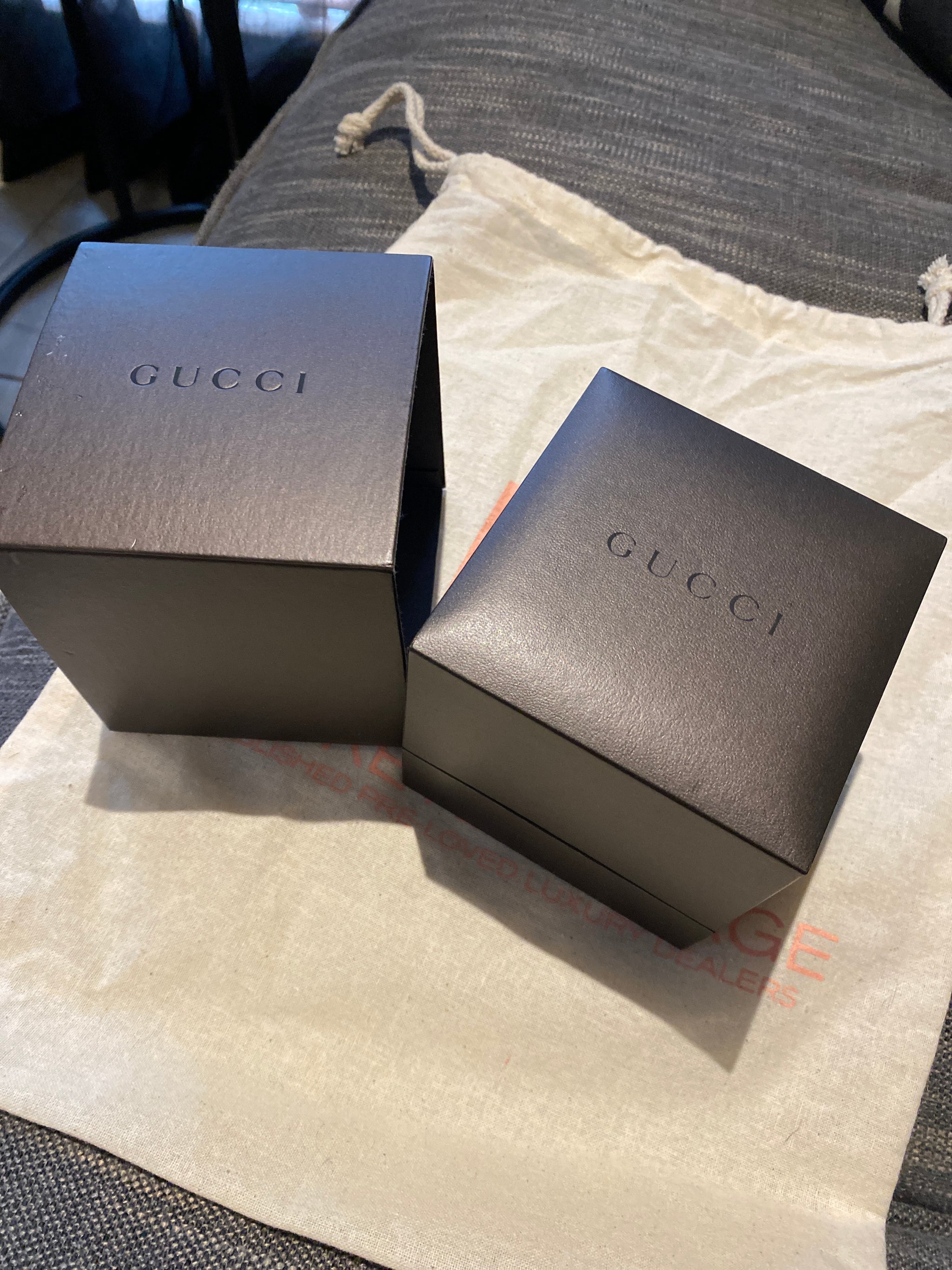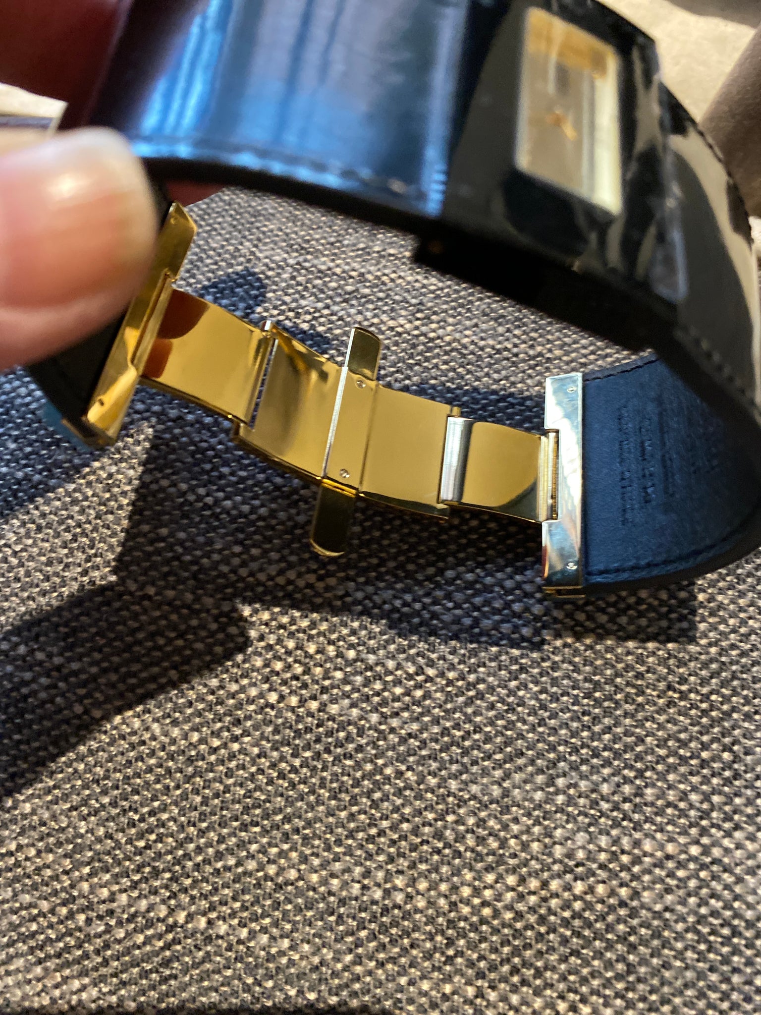 Gucci leather cuff watch with gold face. Full set with box. Still has plastic covers on watches face and gold hardware Size 16 cm . In excellent condition Too small for me