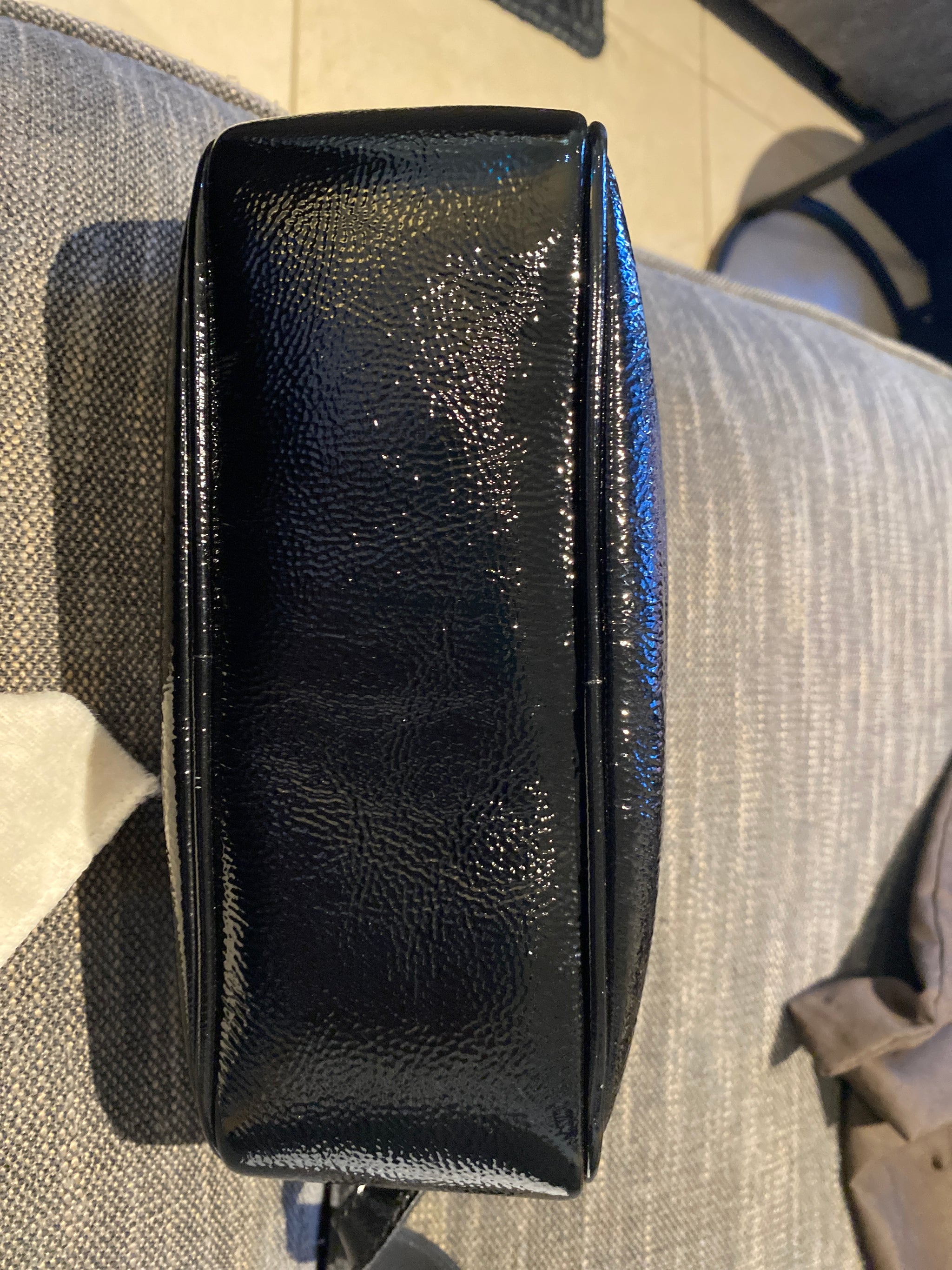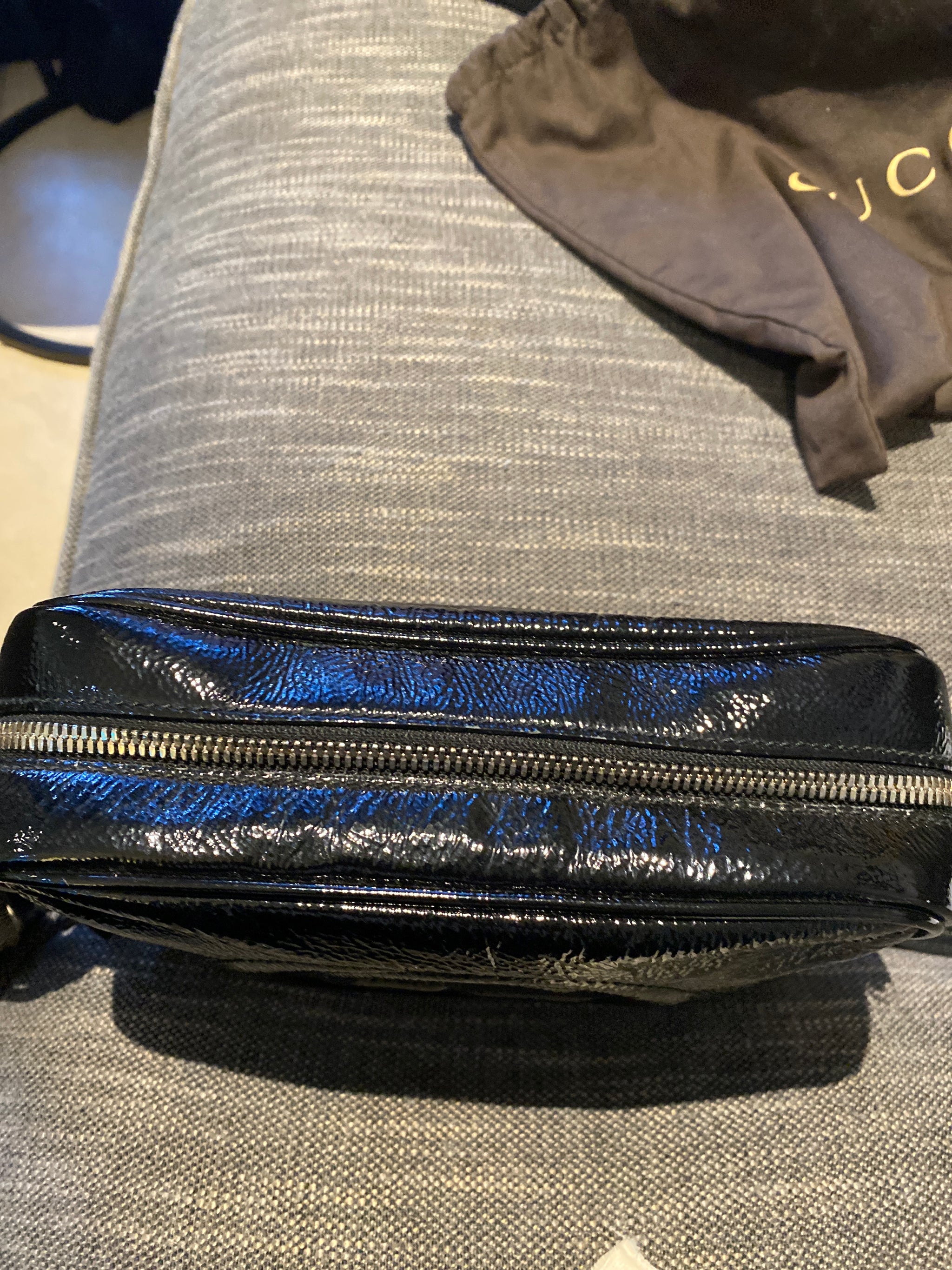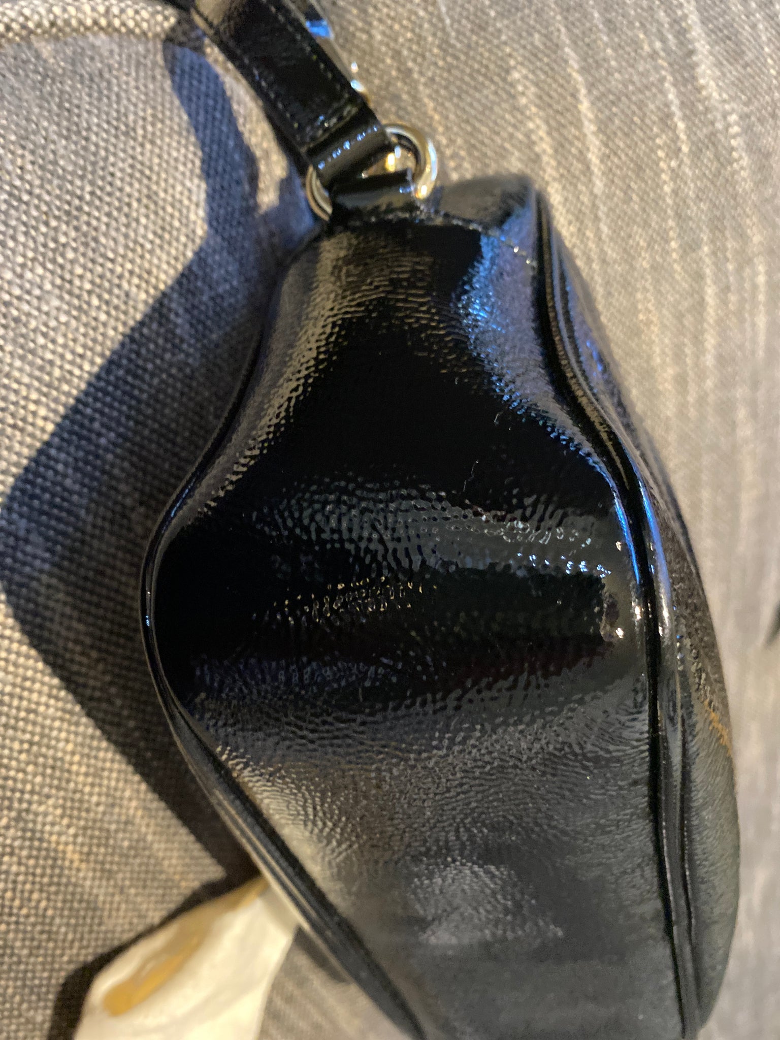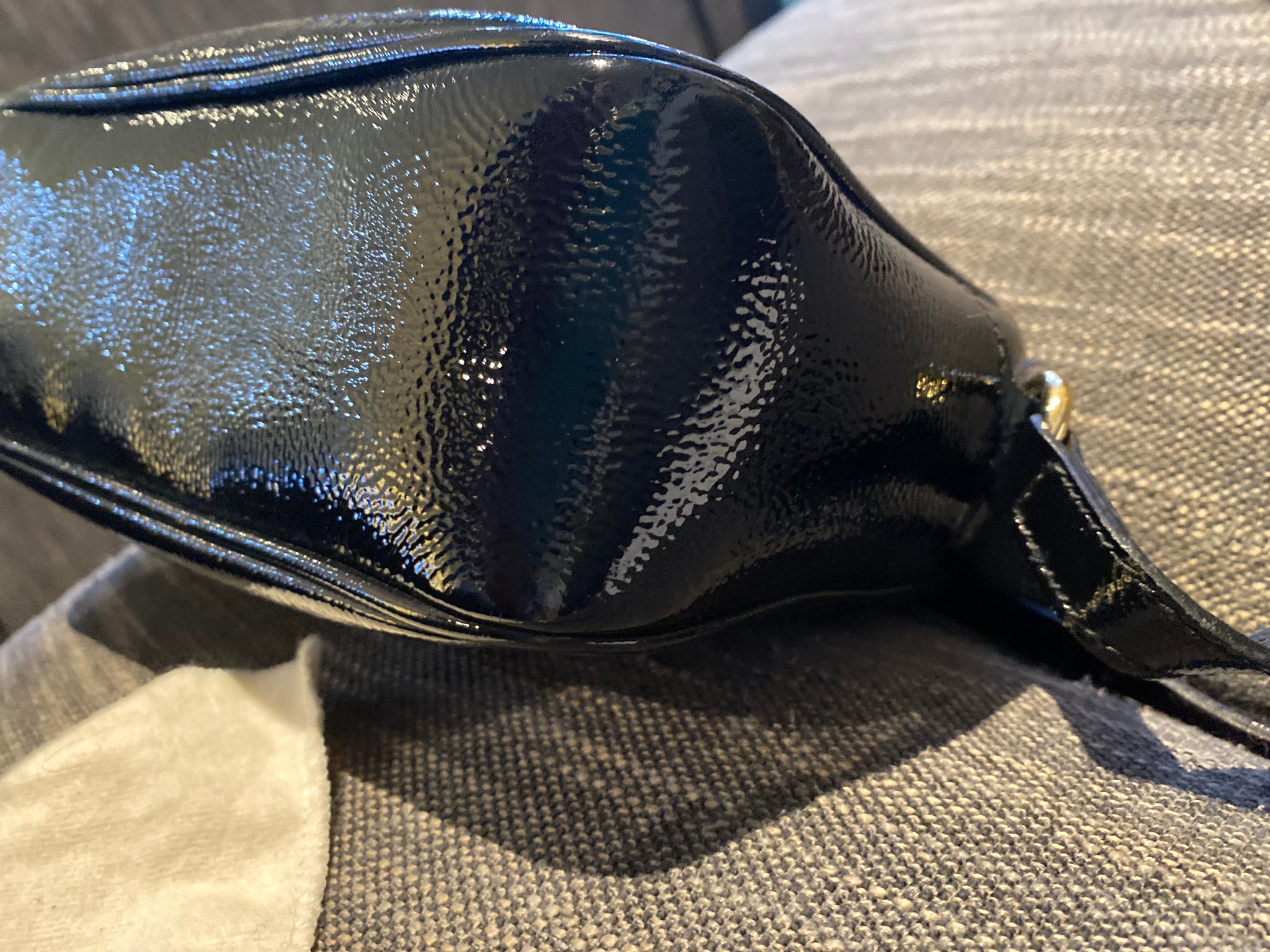 Black Patent Disco Bag. Excellent Condition. Comes with Box , dust bag and cotton strap covers