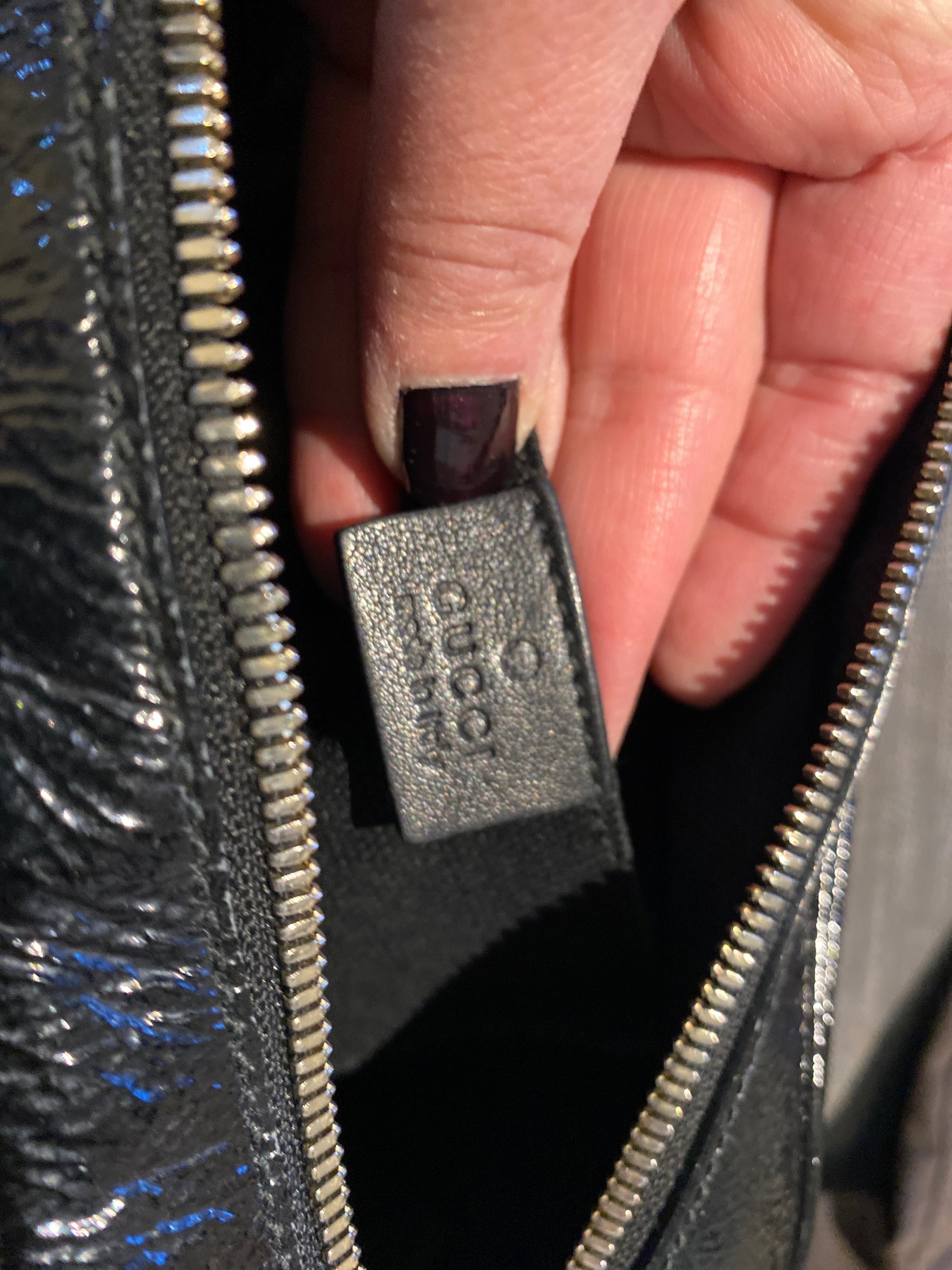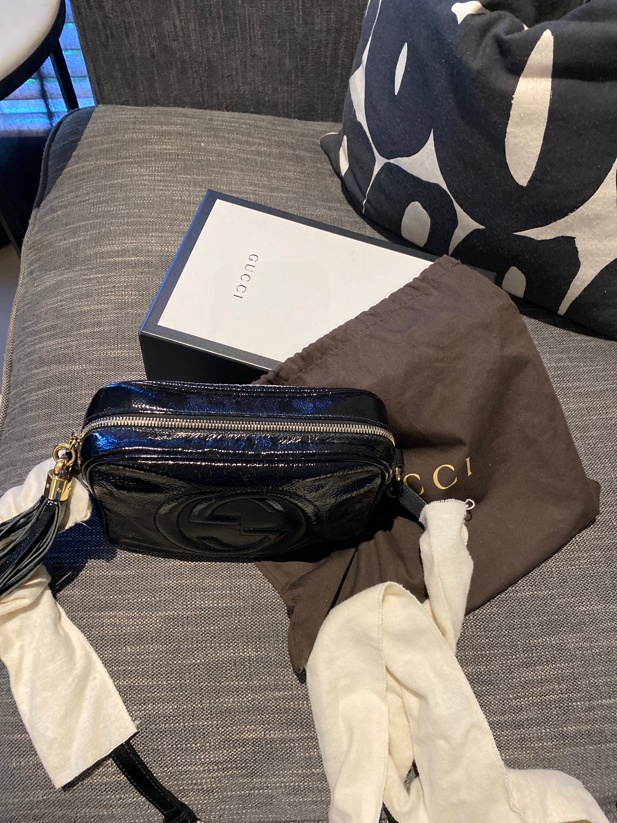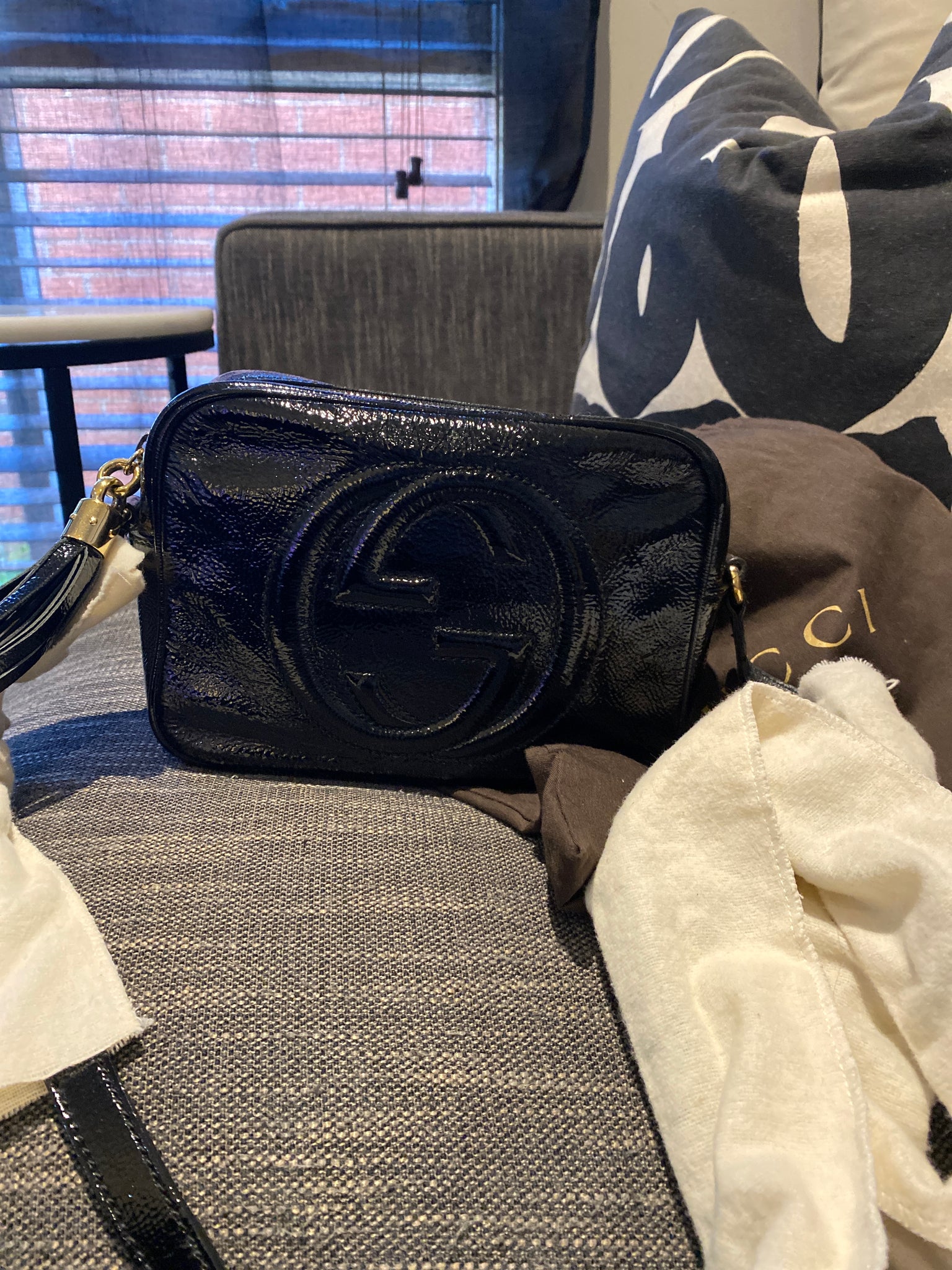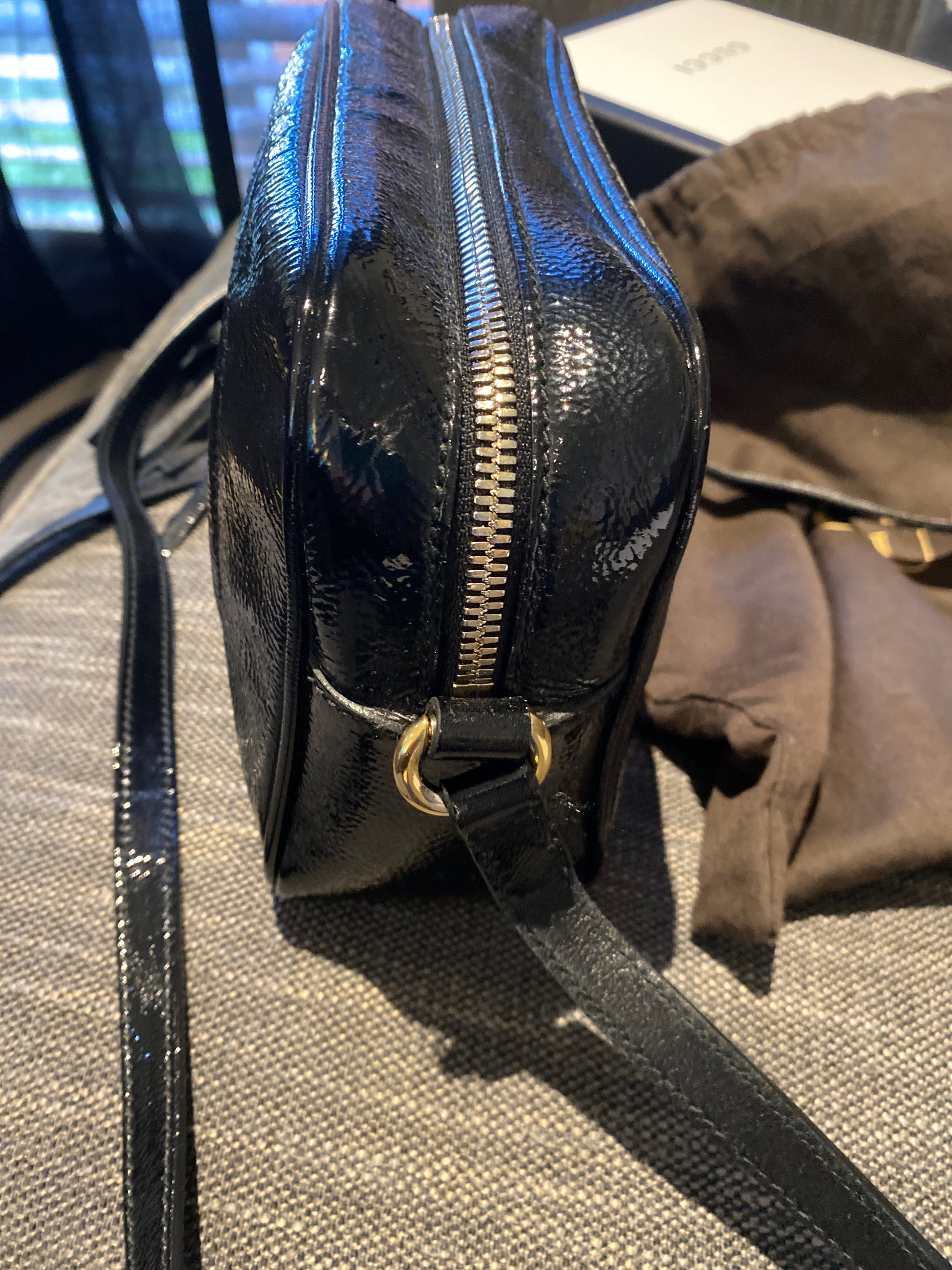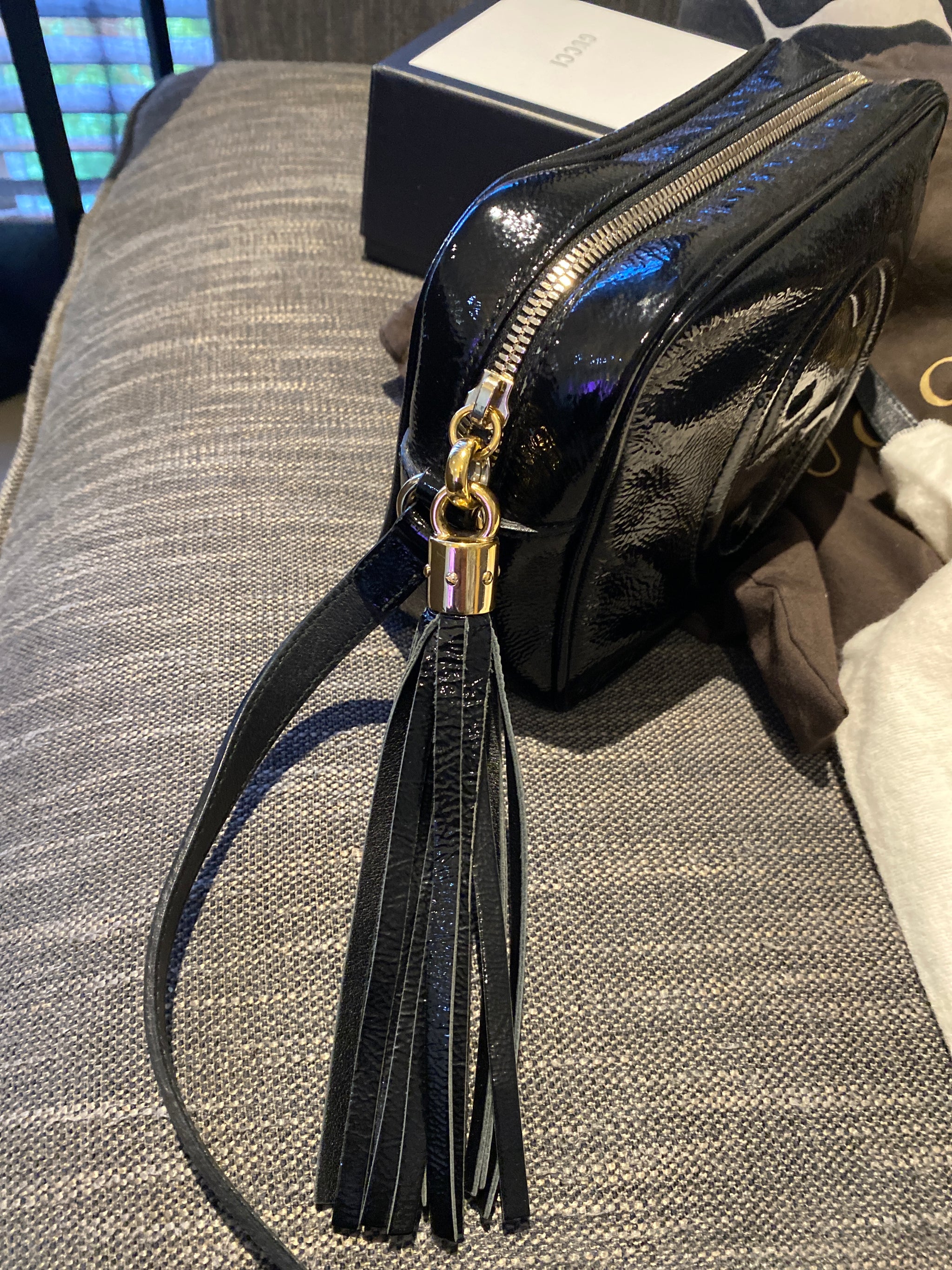 Black Patent Disco Bag. Excellent Condition. Comes with Box , dust bag and cotton strap covers