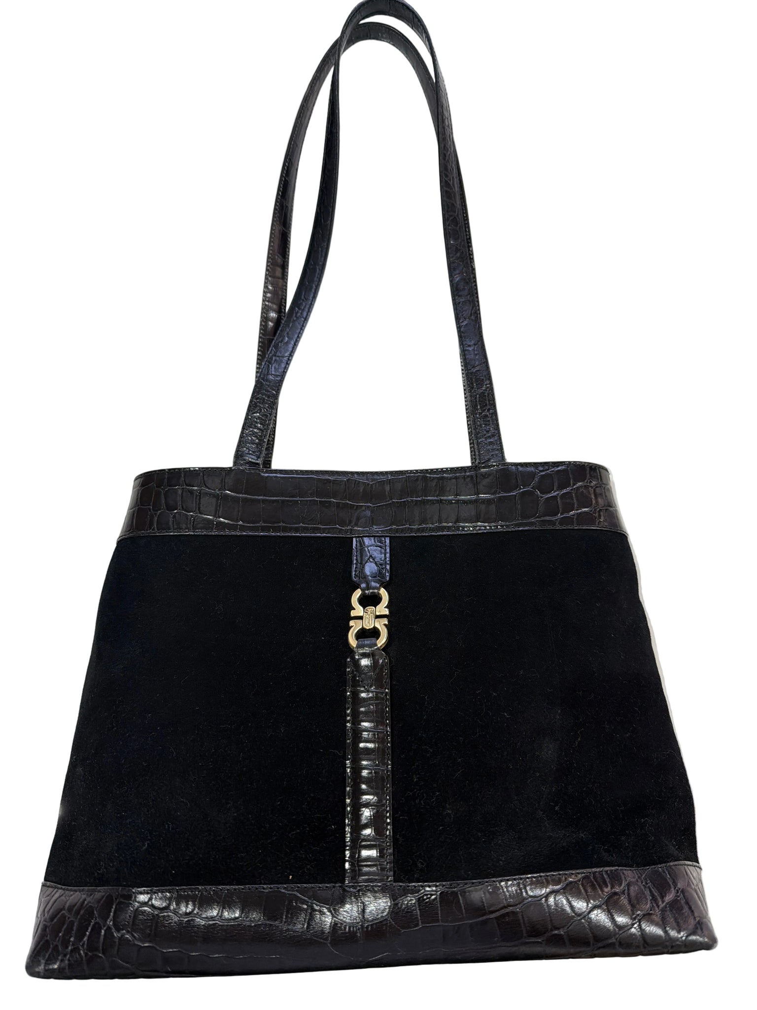 Salvatore Ferragamo | Black Croc and Suede Shoulder Bag (Good Condition) - Cons
