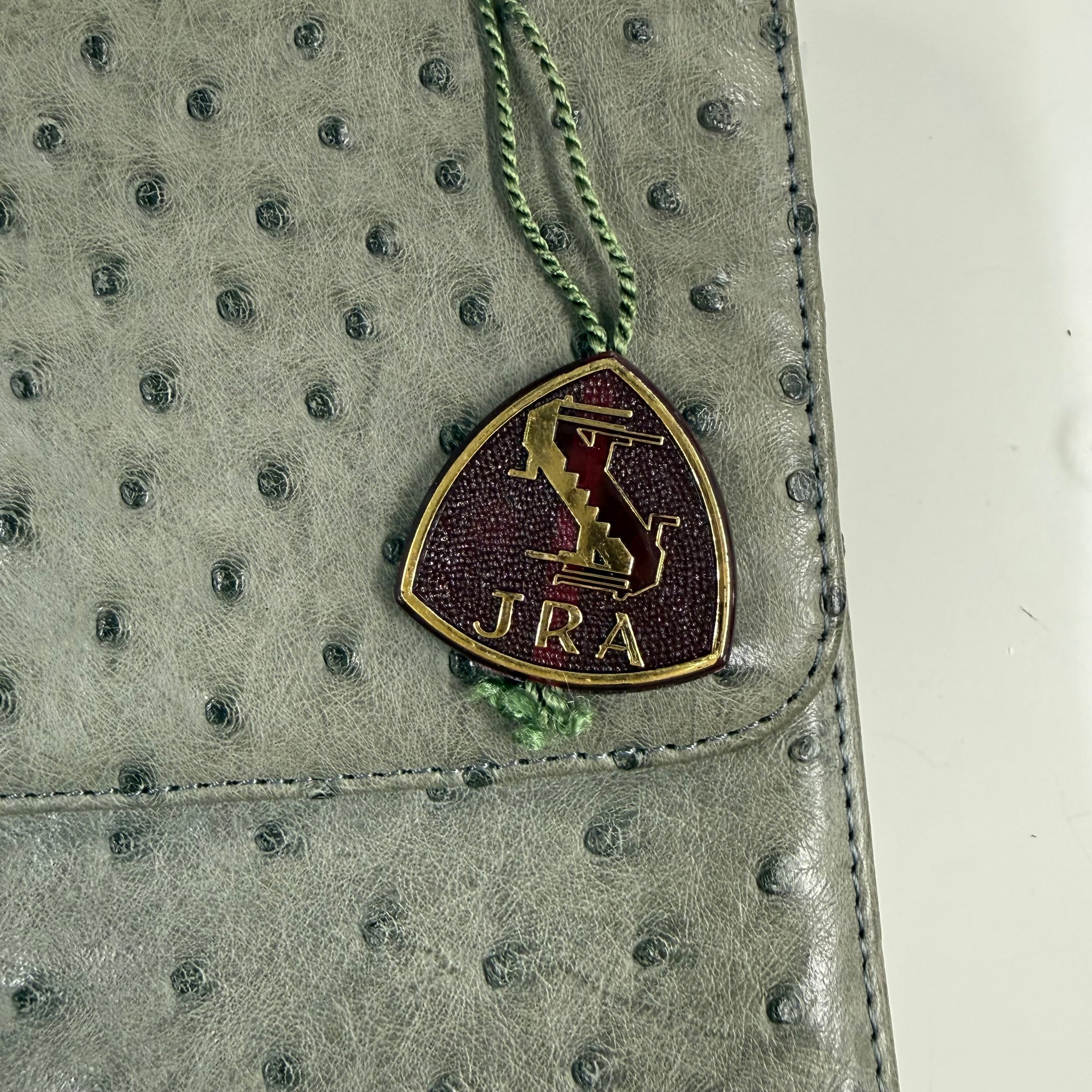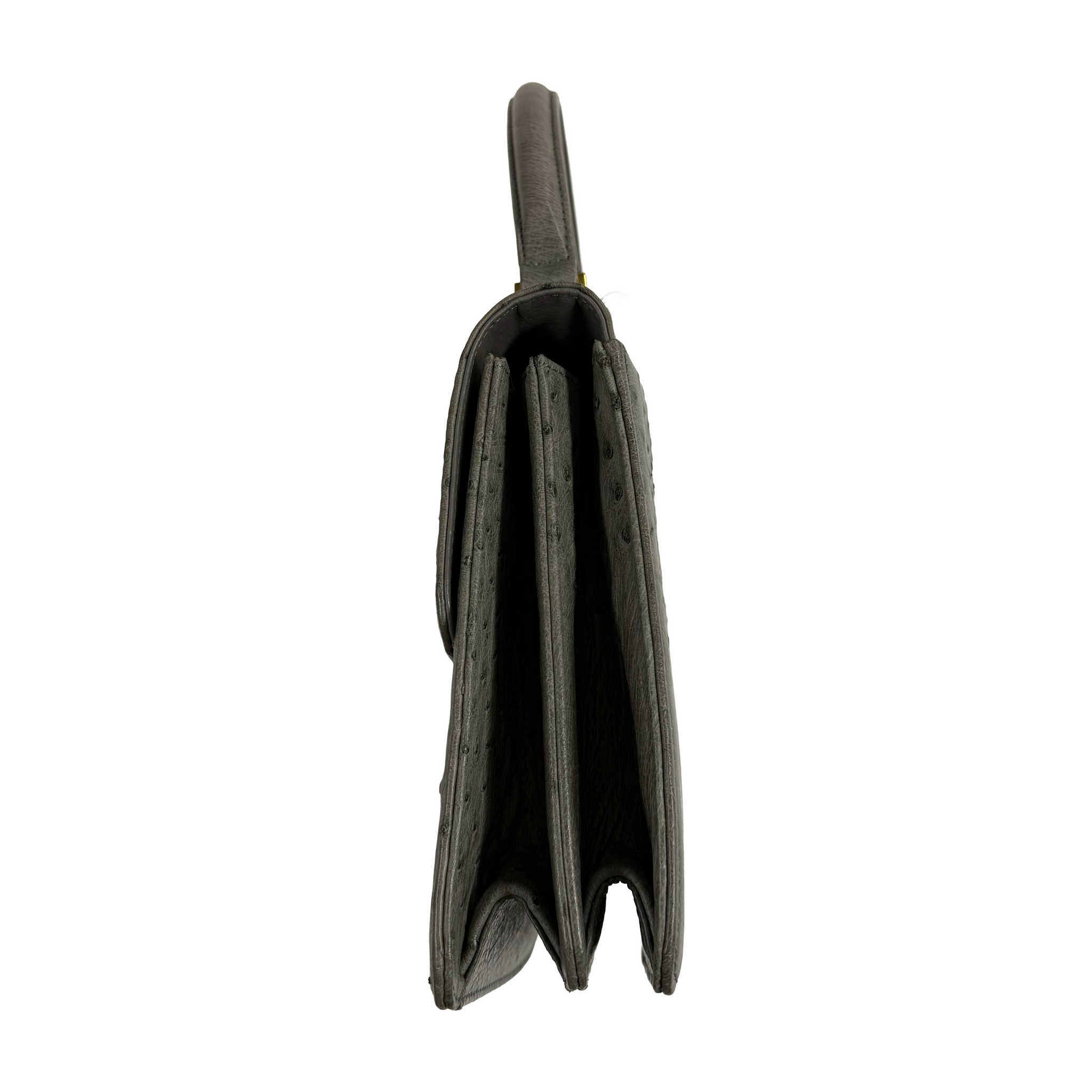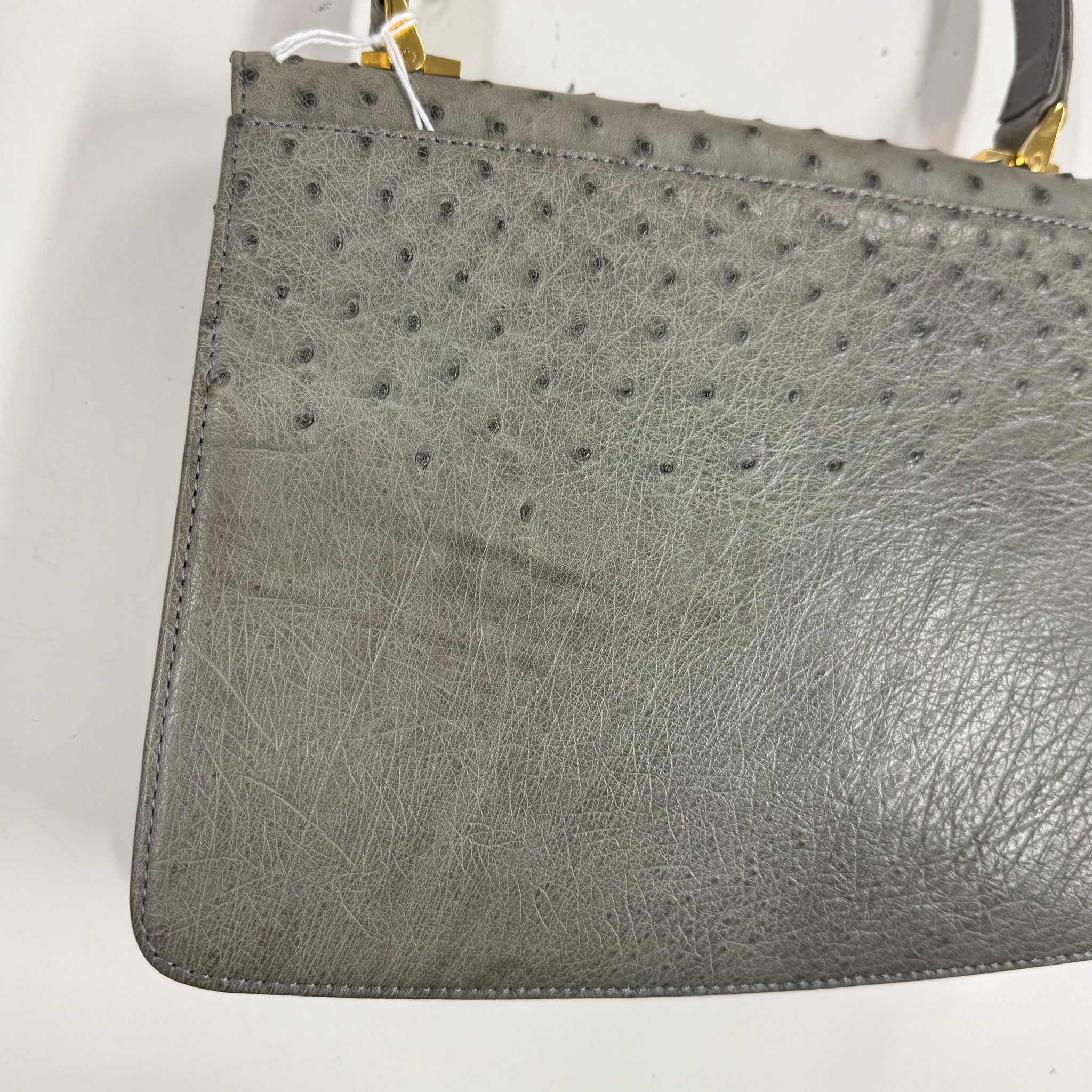 JRA top handle bag crafted in grey ostrich leather with a naturally textured finish. The structured silhouette features a flap closure accented with a gold-tone turn-lock, adding a classic and refined touch. Designed with a sturdy top handle and a compartmented suede-lined interior with zip pockets, the bag offers practical organization while maintaining an elegant profile. A timeless vintage piece suitable for both everyday use and special occasions.