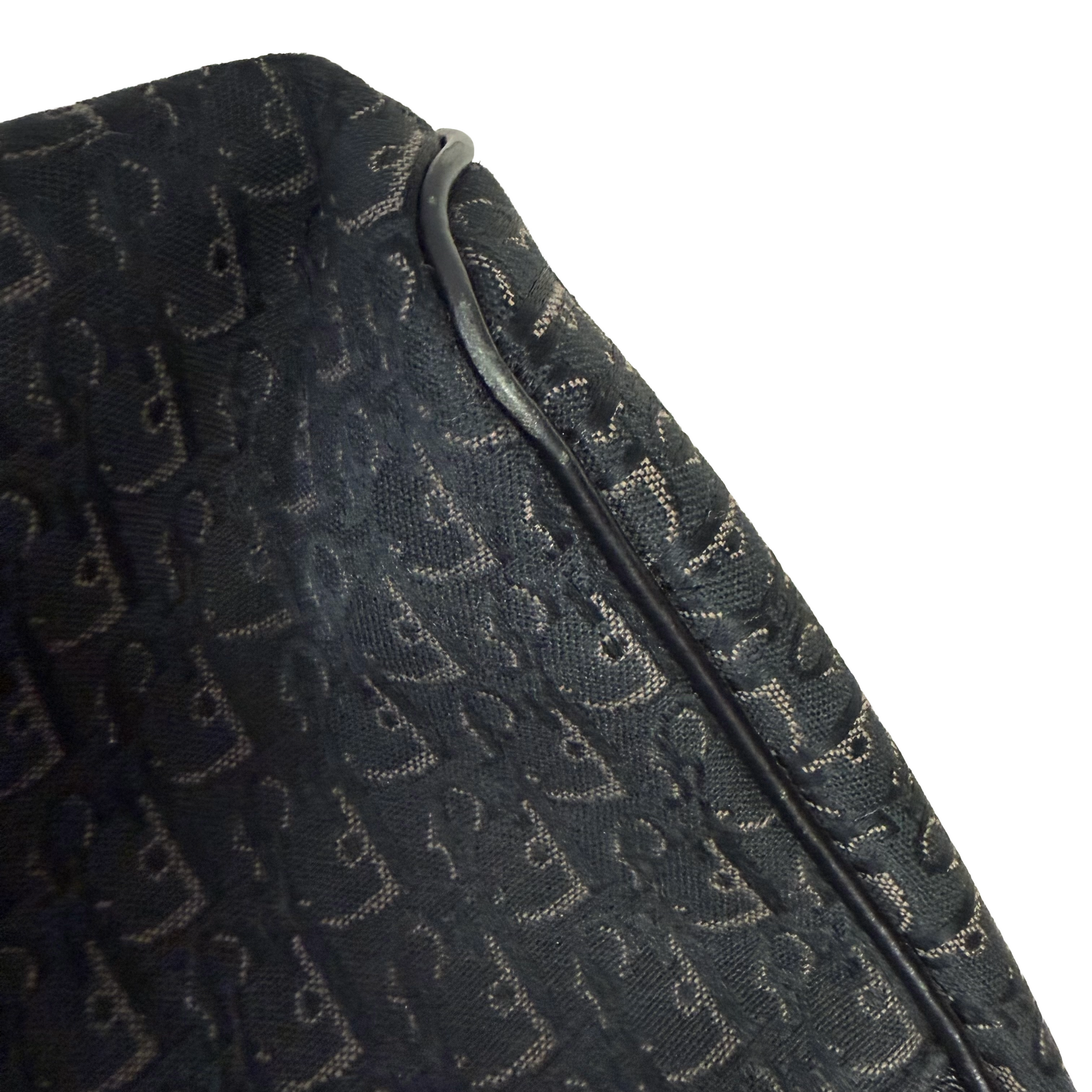 A timeless vintage Christian Dior zip tote crafted in the house’s iconic black monogram canvas, accented with sleek black leather trim and top handles. The structured rectangular silhouette offers a refined yet practical design, ideal for daily use or travel. Finished with a secure top zip closure and a spacious interior featuring breathable mesh lining, this piece reflects Dior’s understated elegance and functional luxury. A versatile archival style that blends classic branding with modern utility.