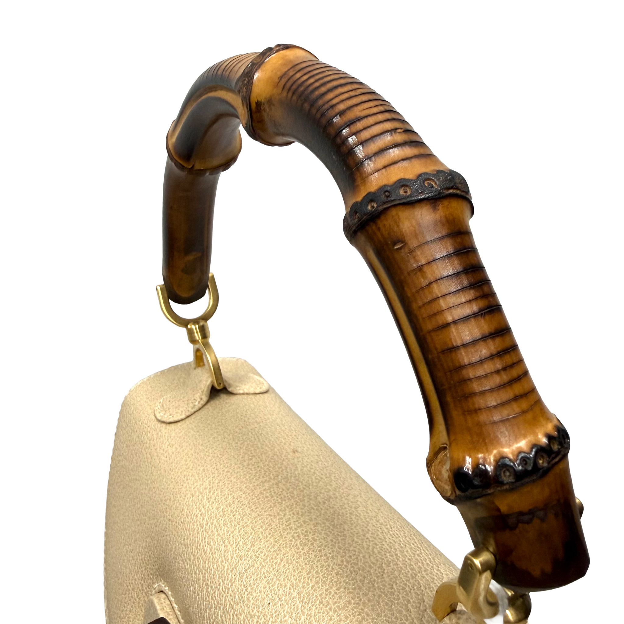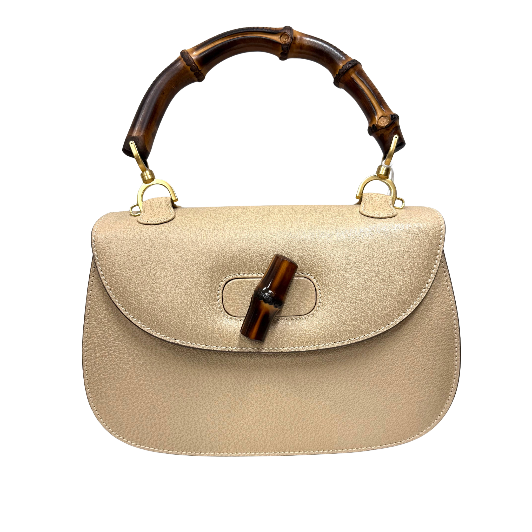 Elegant structured top-handle bag crafted in smooth beige pebbled leather, featuring an iconic curved bamboo handle and matching bamboo turn-lock closure. Minimalist and timeless design with gold-tone hardware — refined and versatile, perfect for both everyday elegance and occasion styling.