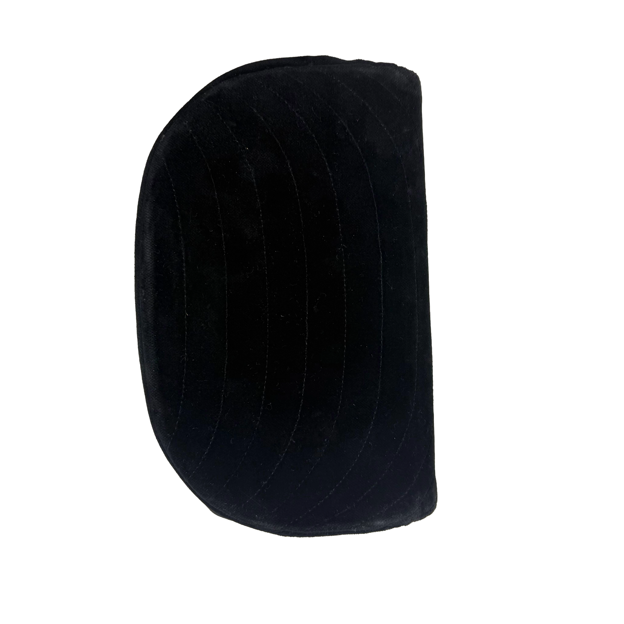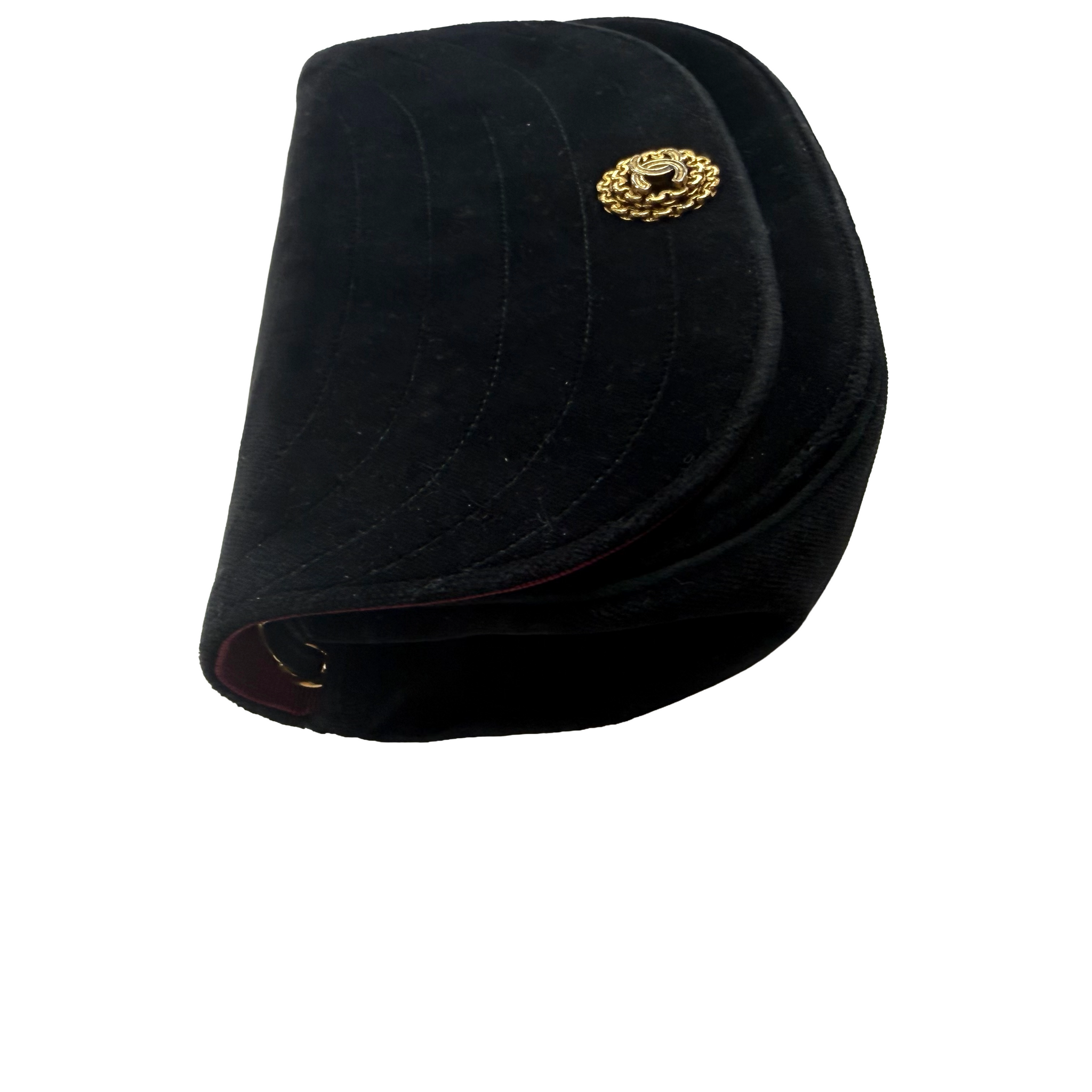 A classic Chanel shoulder bag crafted in black quilted velvet with a curved flap silhouette. Finished with a gold-tone CC logo and a leather-woven chain strap for shoulder or crossbody wear. Compact interior, ideal for essentials. Elegant and timeless.