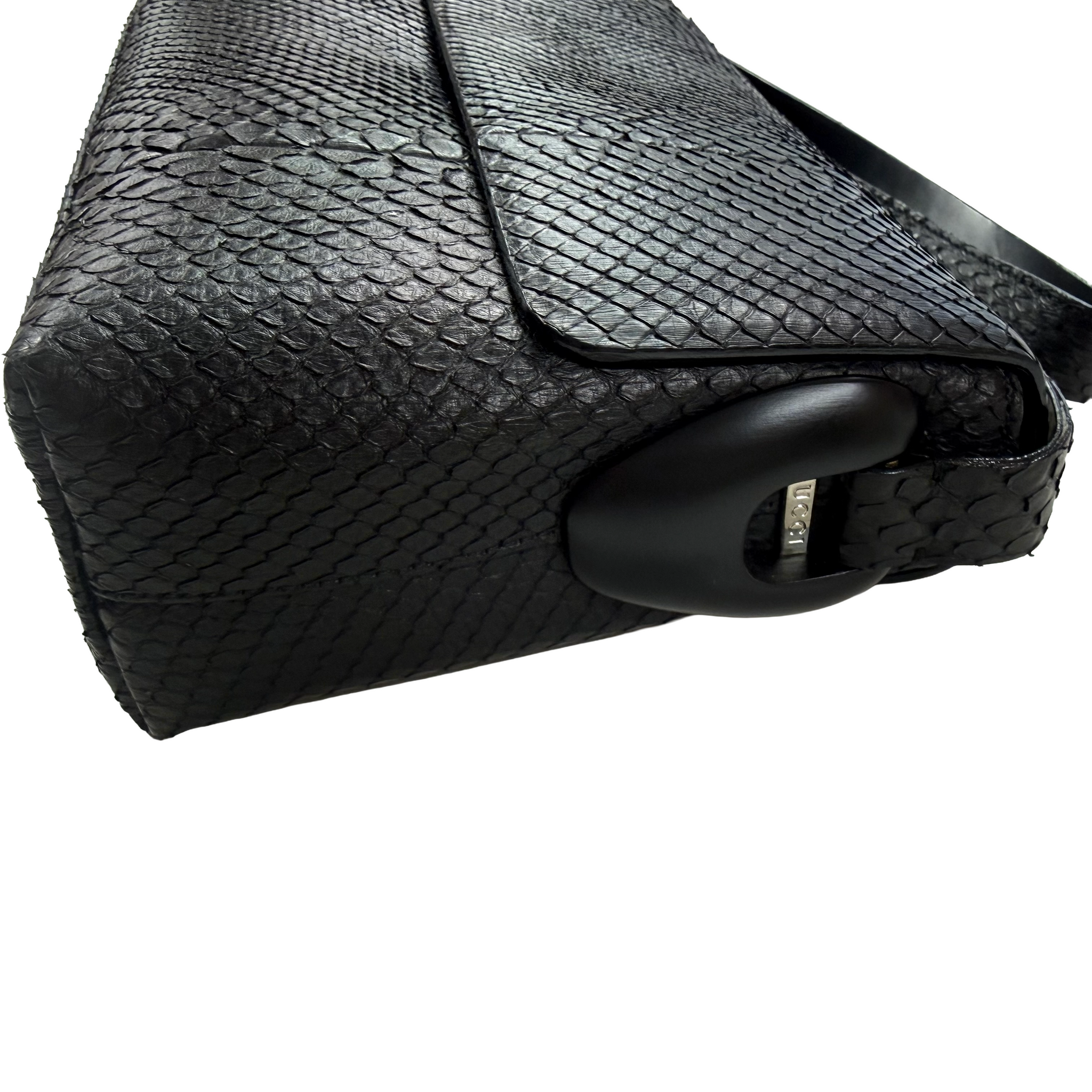 A striking vintage Gucci shoulder bag crafted in textured black python leather, accented with tonal suede trim and a bold sculptural matte black resin handle. The structured silhouette is defined by clean paneled construction and a sleek front flap closure, blending refined minimalism with statement hardware.