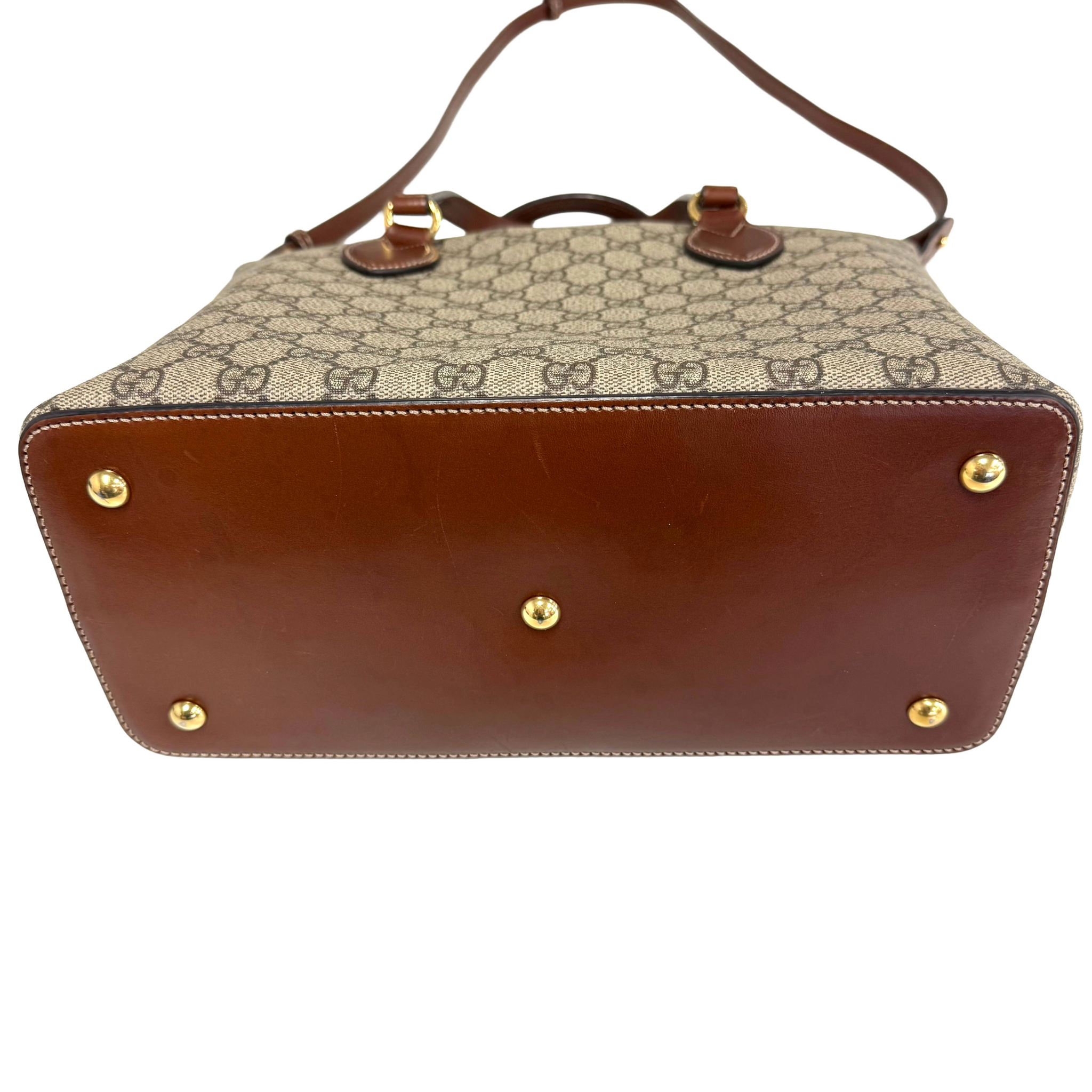 A classic vintage Gucci tote bag crafted in signature GG monogram fabric, complemented by rich brown leather trim. The structured silhouette features dual top handles and an adjustable shoulder strap, offering versatile carry options. Finished with gold-tone hardware and protective metal feet at the base, the bag opens to a spacious interior suitable for daily essentials.