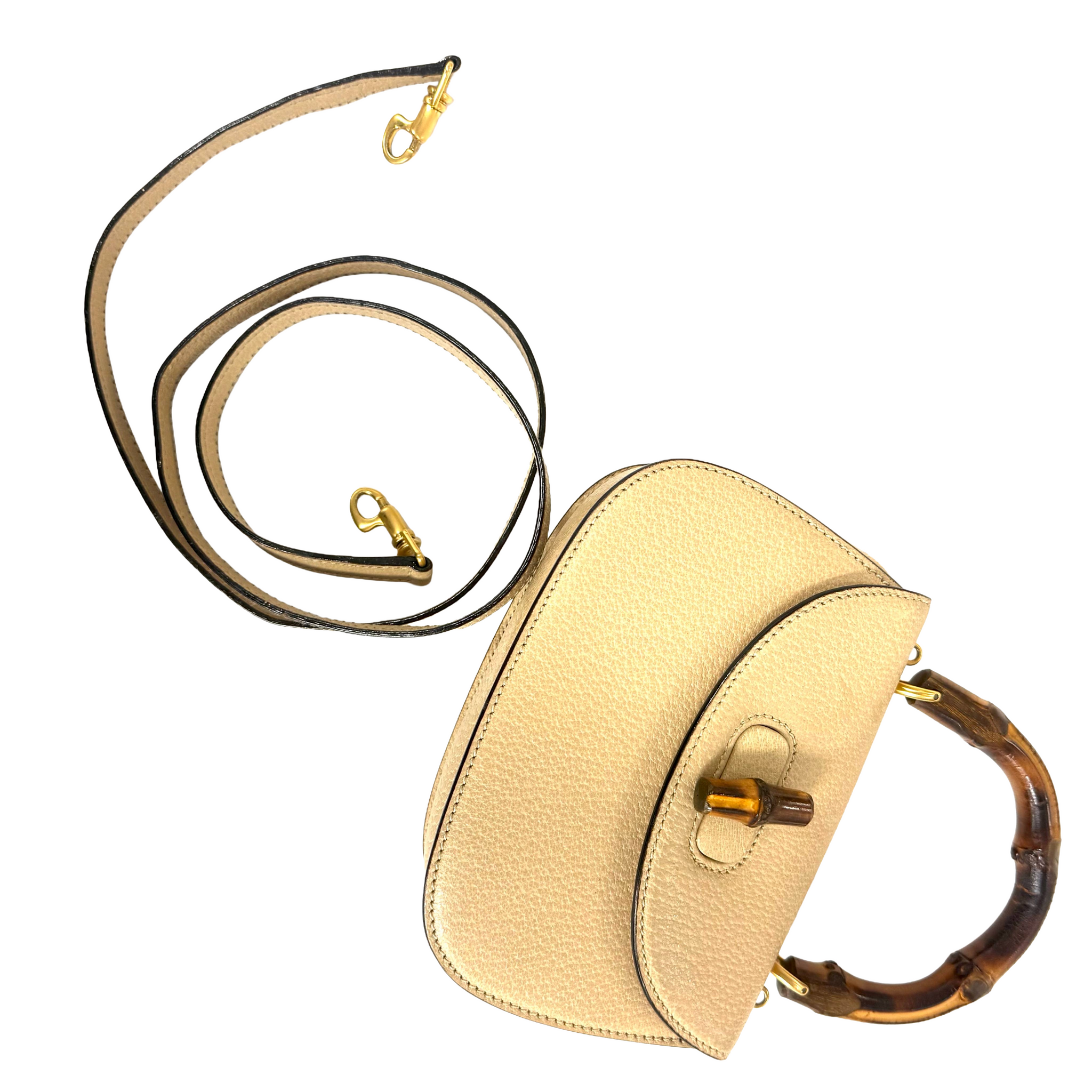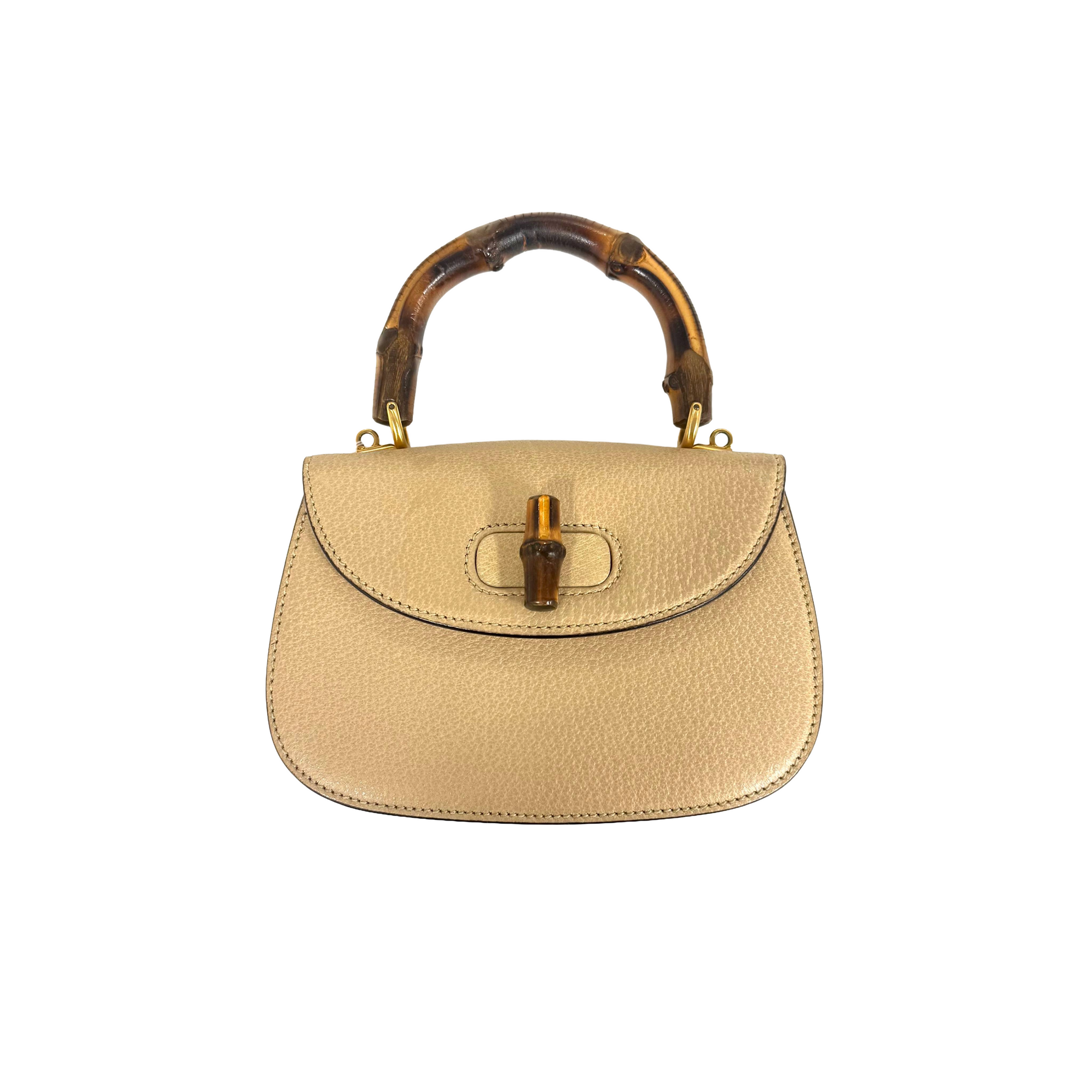 A vintage Gucci 1947 mini top handle bag crafted in textured beige leather with a compact, structured silhouette. The curved flap is secured with the iconic bamboo turn-lock closure, paired with a matching bamboo top handle and gold-tone hardware. Despite its mini size, the interior is thoughtfully designed to hold daily essentials, and the bag includes a detachable leather shoulder strap for versatile wear. A timeless Gucci piece showcasing the house’s signature bamboo detailing in a refined, scaled-down form.