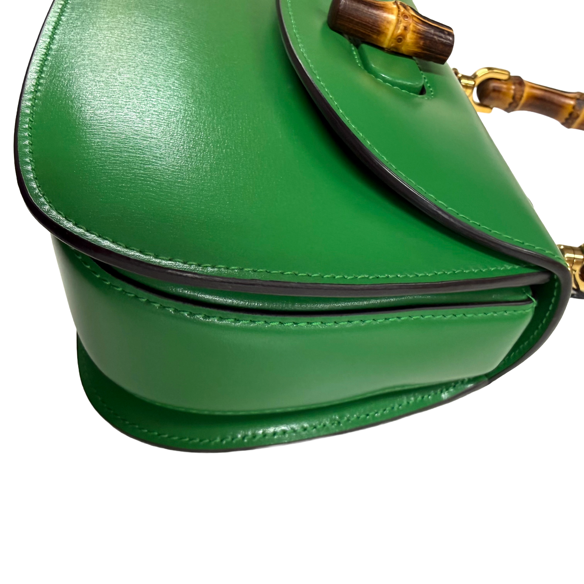 A timeless Gucci bamboo top handle bag crafted in smooth emerald green leather with a structured silhouette and curved front flap. The design is finished with the house’s iconic bamboo turn-lock closure and matching bamboo top handle, complemented by gold-tone hardware.
