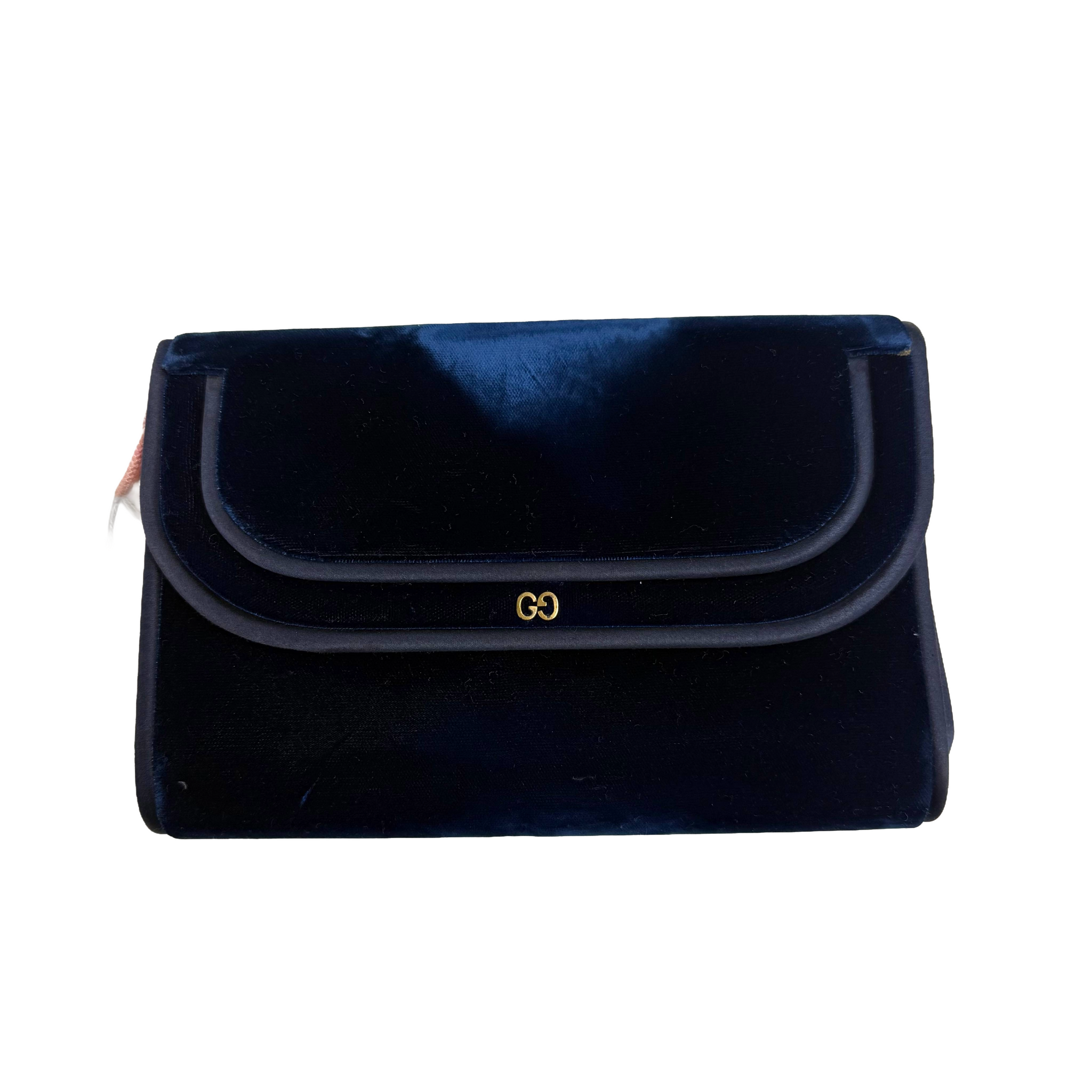 An elegant vintage Gucci evening clutch crafted in rich navy velvet with a softly structured silhouette. The design is finished with tonal piped trim and a delicate gold-tone interlocking GG emblem at the front — a subtle yet iconic signature detail.