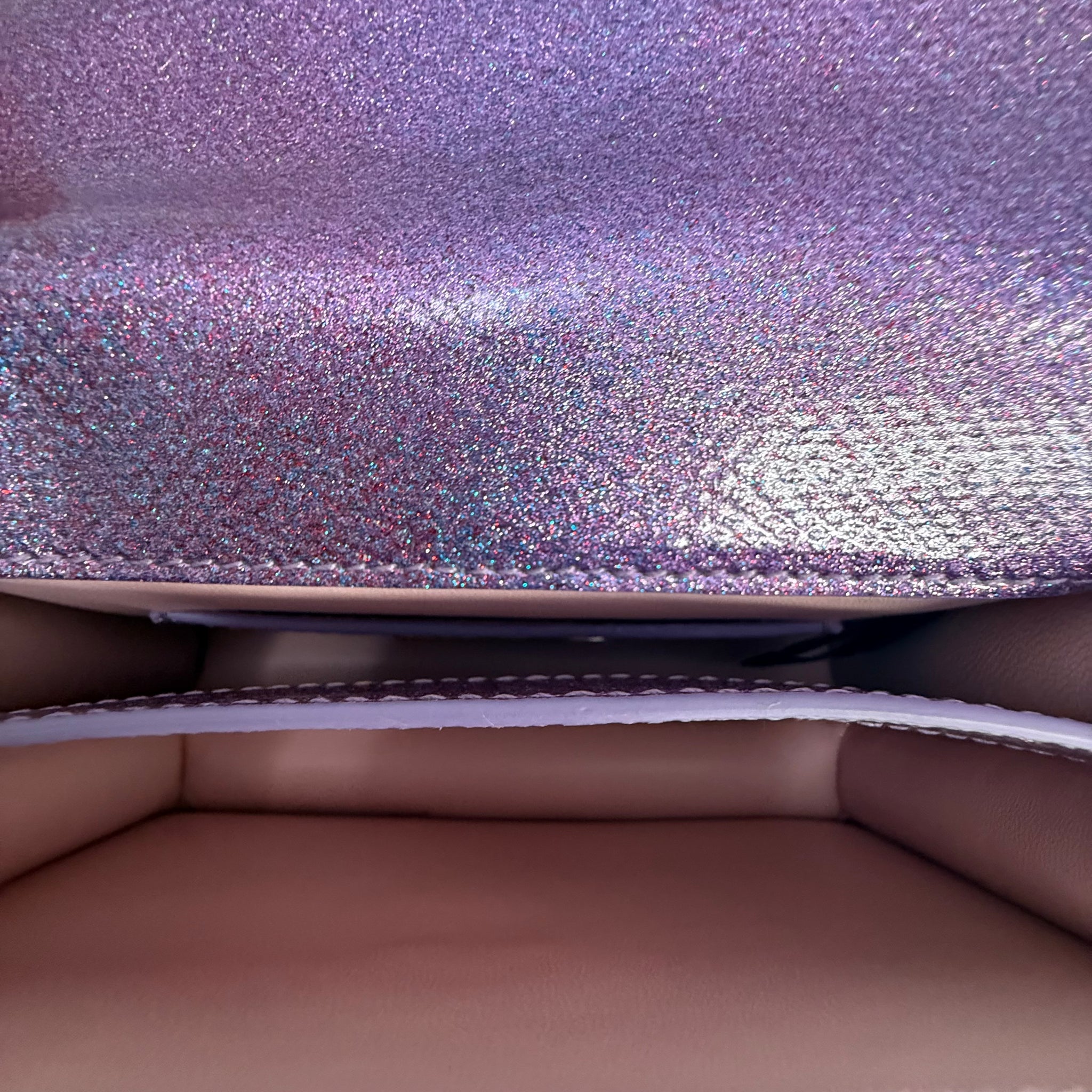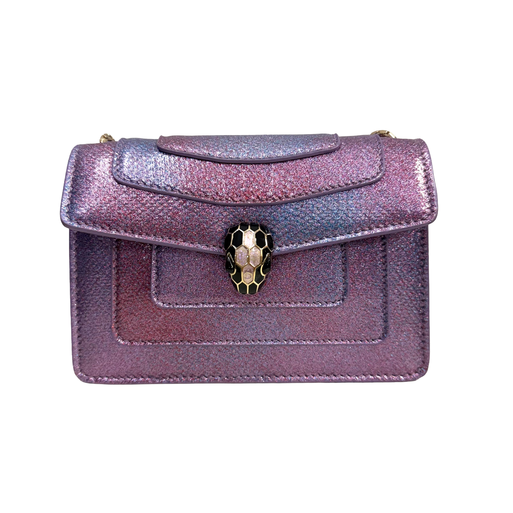 Stunning iridescent mini shoulder bag featuring a shimmering purple metallic finish with subtle gradient tones. Designed with an exotic-texture surface and a signature serpent-head style clasp at the front for a refined statement touch. Comes with a sleek metallic chain strap that allows for shoulder or crossbody wear. A standout evening or special-occasion accessory with a modern-luxury aesthetic.