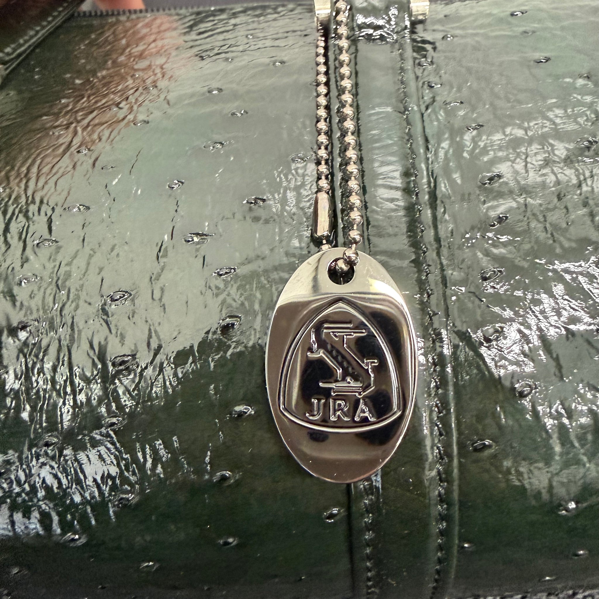A compact JRA barrel-style handbag crafted in glossy dark green ostrich leather with natural quill texture. The cylindrical silhouette features leather handles, a top zip closure, and silver-tone hardware with a JRA logo charm. The interior is fabric-lined with a zip pocket, offering space for everyday essentials. A simple and distinctive design suitable for daily use.