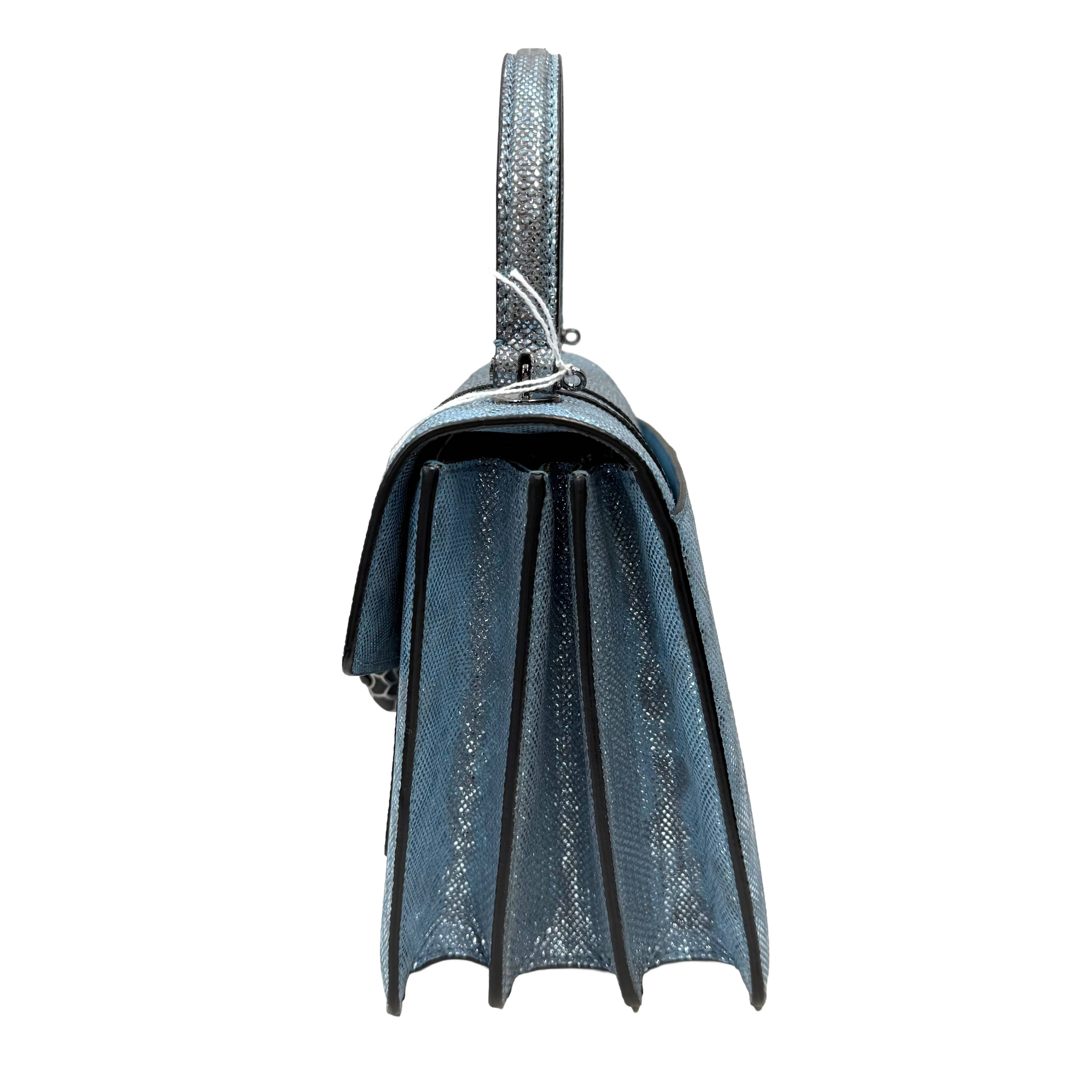 Elegant metallic blue structured top-handle bag featuring a refined textured finish and signature snakehead-style clasp. Comes with a detachable and adjustable crossbody strap for versatile wear. Compact and sophisticated — perfect for both day and evening styling.