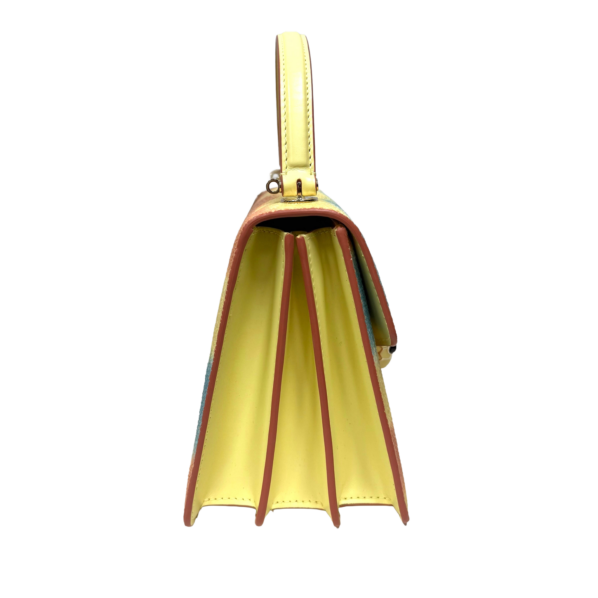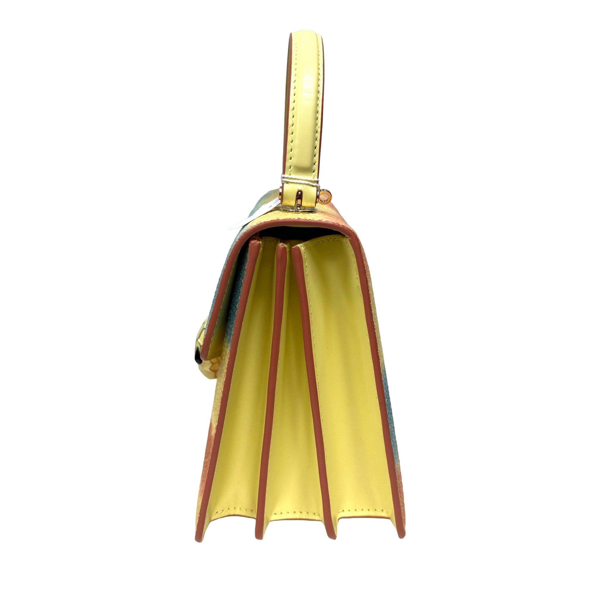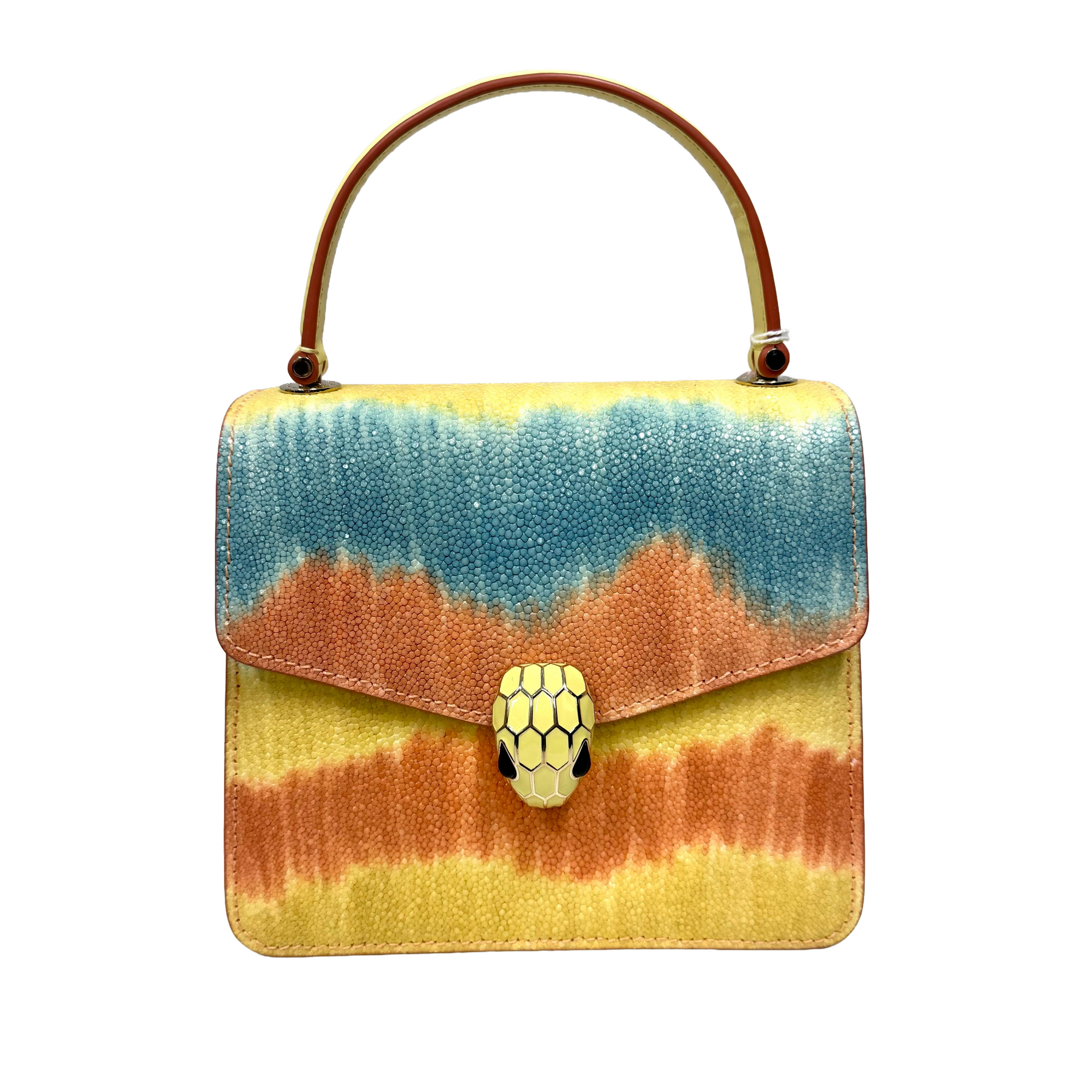 Vibrant mini top-handle bag featuring a sunset-inspired ombré gradient in soft yellow, sky blue, and warm terracotta tones. Designed with a luxurious stingray textured finish and a signature serpent-head inspired clasp. Structured silhouette with a sleek, curved top handle — a bold, collectible statement accessory.
