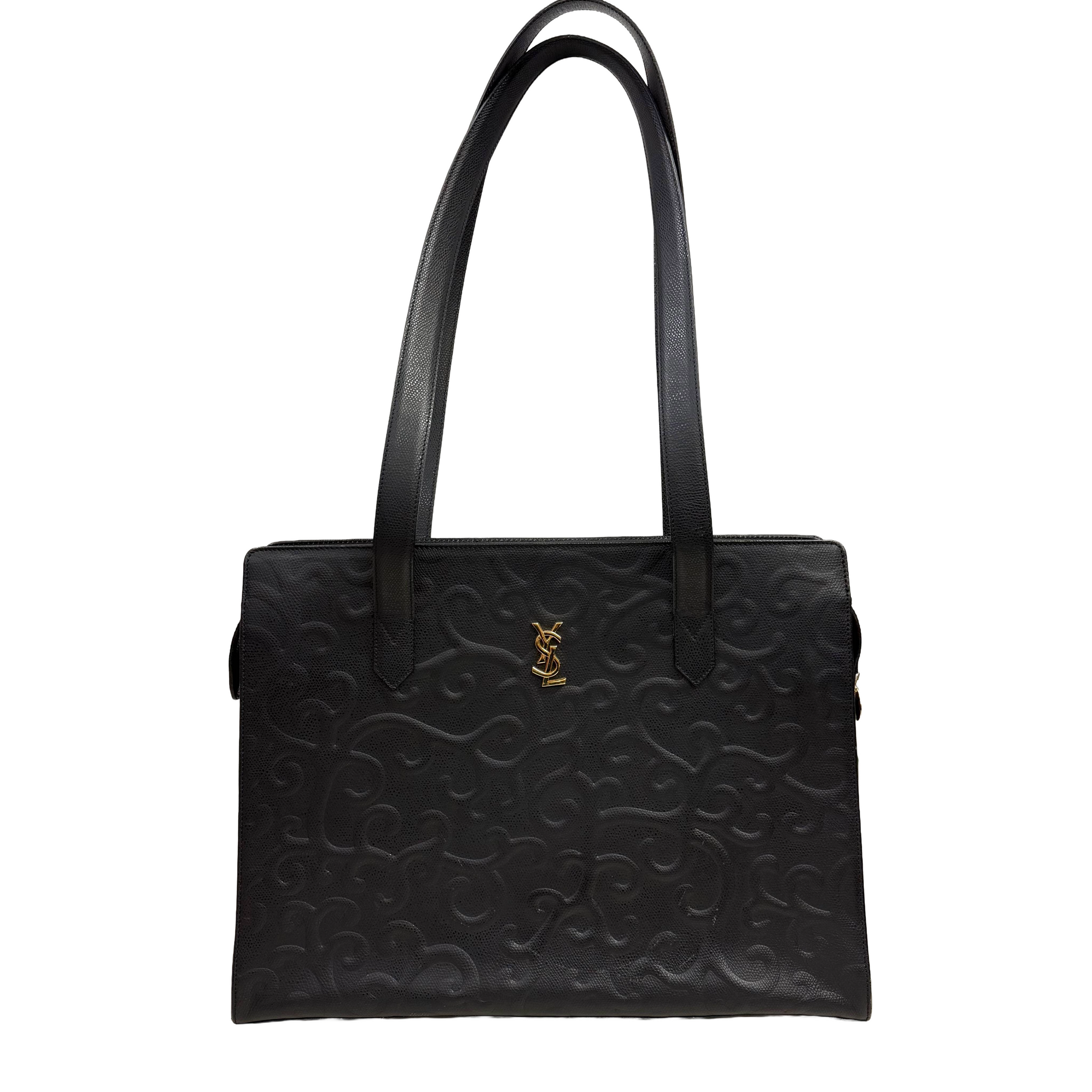 A timeless vintage Yves Saint Laurent shoulder tote crafted in black grained leather with an elegant embossed scroll motif throughout. The structured rectangular silhouette is finished with long shoulder straps and a signature gold-tone YSL logo at the front. Designed for functionality, the top zip closure opens to a spacious interior with multiple zip compartments and black logo-patterned lining, making it ideal for daily use. A classic archival YSL design that blends understated luxury with practical sophistication.